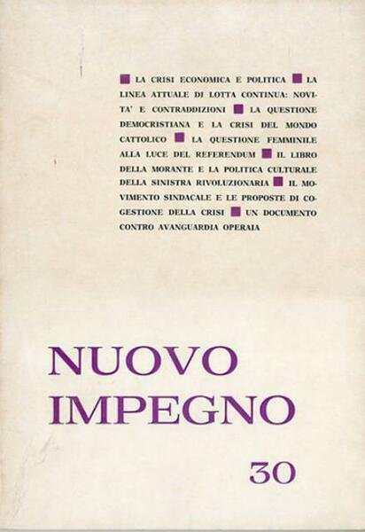 118 p. ; 25 x 17 cm. «Nuovo impegno», rivista bimestrale di letteratura venne fondata a Pisa nel 1965 da un gruppo di giovani intellettuali provenienti dalle file delle organizzazioni del movimento operaio e dai partiti storici della sinistra. Tra questi si ricordano Romano Luperini, Franco Petroni (Direttore Responsabile), Gianfranco Ciabatti e Carlo Alberto Madrignani. La rivista è nota per essere stata una di quelle che anticiparono culture e idee del "movimento di contestazione" che esplose nel biennio 1968-69. Nei primi anni l'interesse principale della redazione della rivista fu quello letterario e culturale, con la rivendicazione - fin dal titolo - di un nuovo impegno degli intellettuali in ambito sociale e politico. All'inizio si parlava di "cultura rivoluzionaria" e di "letteratura di opposizione"; il primo numero presentava un carteggio tra Gianfranco Ciabatti e Franco Fortini. Dopo pochi numeri la rivista lasciava decadere la sua prima autodefinizione di "bimestrale di letteratura" per occuparsi essenzialmente di problemi politici, teorici e culturali connessi alla critica della società capitalista. La svolta avvenne nel 1967 e nasceva dalla convinzione che "una cultura rivoluzionaria era possibile solo in presenza di una pratica rivoluzionaria". Prima lavorò in rapporto con il gruppo toscano de «Il potere operaio» pisano che editava il giornale omonimo, poi - dopo lo scioglimento del gruppo - continuò le pubblicazioni come organo, sia pure indiretto, della «Lega dei comunisti» col sottotitolo «Rivista trimestrale marxista-leninista». «Nuovo impegno» ha continuato ad essere pubblicato fino al 1976 per 34 numeri complessivi. La sua esperienza si conclude con la partecipazione della «Lega dei Comunisti» e della redazione di «Nuovo Impegno» alla fondazione di Democrazia Proletaria nel 1977. Brossura editoriale, coperta in cartoncino flessibile plastificato lucido. Qualche segno del tempo alla coperta e al taglio (ingiallimento della carta), per il resto esemplare integro. Codice libreria 8156.