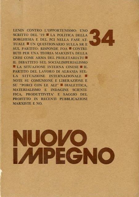 187 p. ; 21 x 15 cm. «Nuovo impegno», rivista bimestrale di letteratura venne fondata a Pisa nel 1965 da un gruppo di giovani intellettuali provenienti dalle file delle organizzazioni del movimento operaio e dai partiti storici della sinistra. Tra questi si ricordano Romano Luperini, Franco Petroni (Direttore Responsabile), Gianfranco Ciabatti e Carlo Alberto Madrignani. La rivista è nota per essere stata una di quelle che anticiparono culture e idee del "movimento di contestazione" che esplose nel biennio 1968-69. Nei primi anni l'interesse principale della redazione della rivista fu quello letterario e culturale, con la rivendicazione - fin dal titolo - di un nuovo impegno degli intellettuali in ambito sociale e politico. All'inizio si parlava di "cultura rivoluzionaria" e di "letteratura di opposizione"; il primo numero presentava un carteggio tra Gianfranco Ciabatti e Franco Fortini. Dopo pochi numeri la rivista lasciava decadere la sua prima autodefinizione di "bimestrale di letteratura" per occuparsi essenzialmente di problemi politici, teorici e culturali connessi alla critica della società capitalista. La svolta avvenne nel 1967 e nasceva dalla convinzione che "una cultura rivoluzionaria era possibile solo in presenza di una pratica rivoluzionaria". Prima lavorò in rapporto con il gruppo toscano de «Il potere operaio» pisano che editava il giornale omonimo, poi - dopo lo scioglimento del gruppo - continuò le pubblicazioni come organo, sia pure indiretto, della «Lega dei comunisti» col sottotitolo «Rivista trimestrale marxista-leninista». «Nuovo impegno» ha continuato ad essere pubblicato fino al 1976 per 34 numeri complessivi. La sua esperienza si conclude con la partecipazione della «Lega dei Comunisti» e della redazione di «Nuovo Impegno» alla fondazione di Democrazia Proletaria nel 1977. Sommario del n. 34: Crisi economica e lotta di classe; Il dibattito nella sinistra rivoluzionaria italiana; Imperialismo e socialimperialismo; Note e recensioni. Direttore resp.: Franco Petroni. Brossura editoriale, coperta in cartoncino flessibile plastificato lucido. Titolo impresso in rosso al piatto e al dorso. Leggero ingiallimento della carta interna, per il resto esemplare integro. Codice libreria 8404.