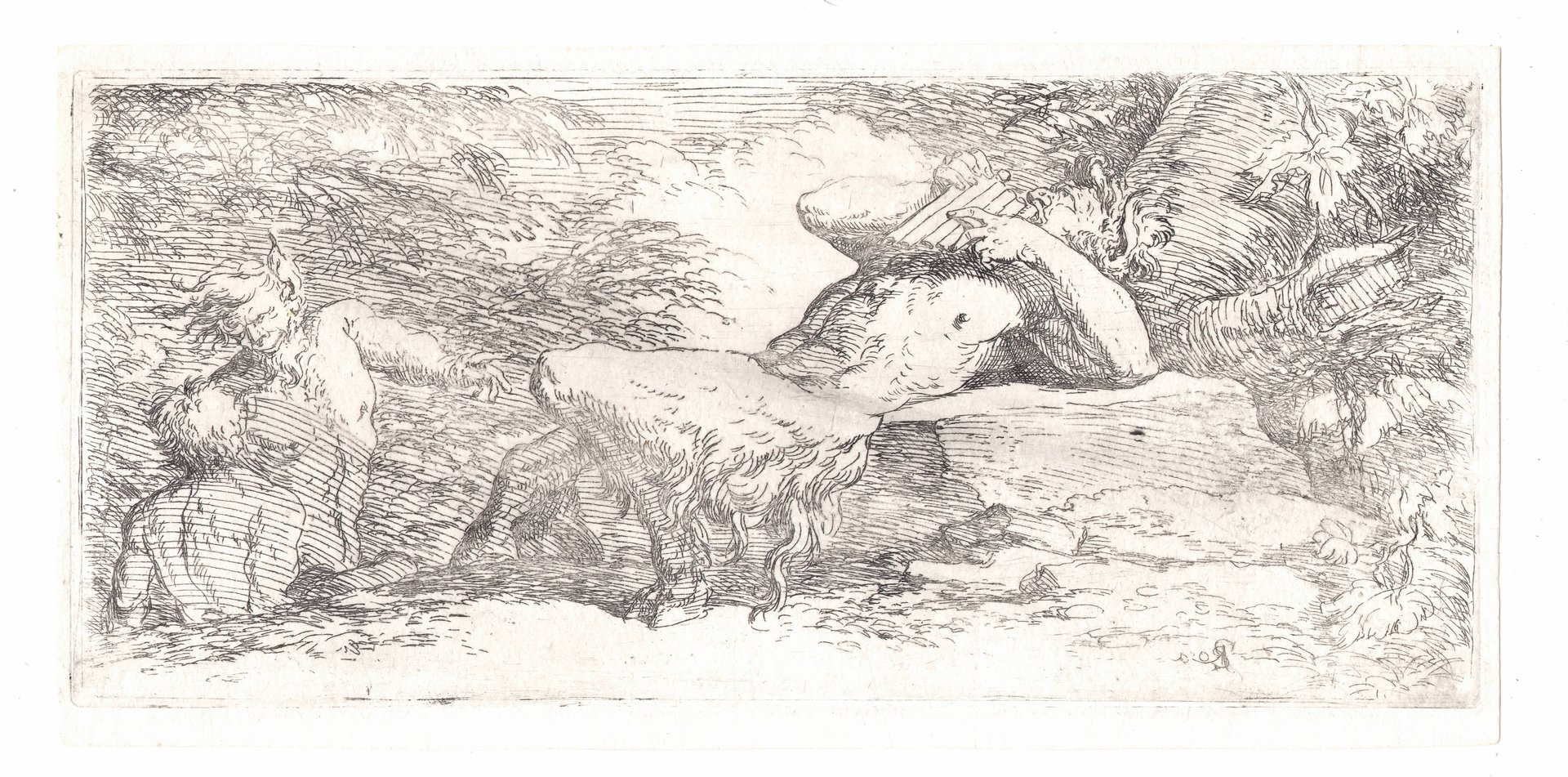 Questa stampa fa parte della serie Gruppo dei Tritoni composta da otto tavole. Nel foglio immersi in una natura rigogliosa troviamo tre figure colte in pose e atteggiamenti differenti. Partendo da sinistra assistiamo ad una sorta di conversazione gesticolante tra due fauni, ed è proprio con la mano sinistra che uno dei due indica Pan intento a suonare il flauto. Viene colto semi sdraiato su di una roccia, in una posa che accentua la plasticità del corpo e la muscolatura. Il tratto incisivo e parallelo crea contrasti chiaroscurali che esaltano le zone di luce e i particolari. In basso a destra firma incisa: SRosa.