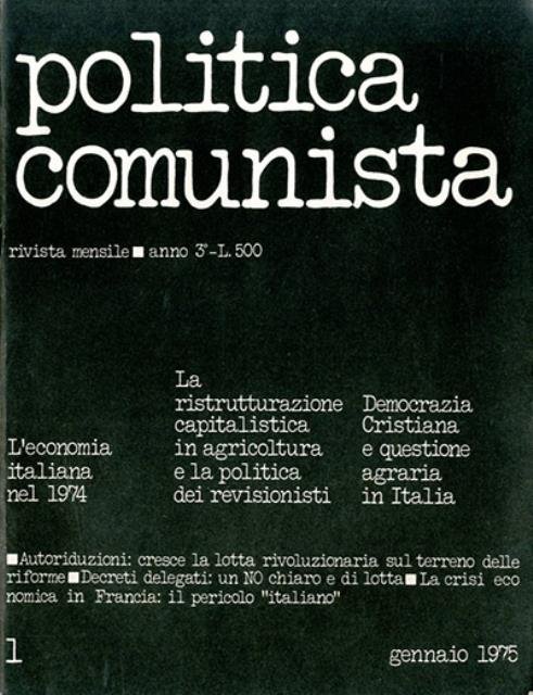 9 fasc. : ill. ; 27 x 21 cm. Nove fascicoli (12 numeri) del terzo e quarto anno della rivista «Politica comunista»: n. 1 (gen. 1975); 2 (feb. 1975); 3 (mar. 1975); 4 (apr. 1975); 5/6 (estate 1975); 7 (set.-ott. 1975); 1 (gen. 1976); 2/3 (feb.-mar. 1976); 4/5 (apr.-mag. 1976). L'organizzazione di estrema sinistra «Avanguardia operaia» ebbe diverse testate di riferimento, alcune di tipo teorico e altre di agitazione e propaganda. La prima pubblicazione periodica teorica di AO fu la testata mensile «Avanguardia operaia», di cui furono pubblicati 27 numeri tra il 1968 ed il 1972. Essa fu in seguito sostituita da «Politica comunista», rivista bimestrale pubblicata dal 1973 al 1976. Singoli approfondimenti vennero pubblicati tra il 1970 e il 1973 con il nome di «Quaderni di Avanguardia operaia». Nel 1971 nacque anche la rivista «Avanguardia operaia» che venne pubblicata tra il 1971 e il 1974, prima quindicinale, poi settimanale, e aveva una finalità di informazione, propaganda e agitazione politica. Questo ruolo, a partire dal 1974 fu poi sostenuto dal giornale «Quotidiano dei lavoratori» (1974-1979). Quest'ultimo, diretto da Silverio Corvisieri, ebbe discreta diffusione nelle città industriali del nord Italia. Fascicoli spillati con coperta in cartoncino flessibile colorato, all'interno numerose fotografie in b/n. Codice libreria 8652.