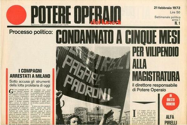 24 fasc. : ill. ; 58 x 42 cm. Il giornale (settimanale) era l'espressione del gruppo politico omonimo che si era originato dal nucleo redazionale della rivista «La Classe» (già parte della redazione di «Classe operaia»). Direttore della rivista fu, fino al suo arresto nel novembre 1969, Francesco Tolin sostituito per un breve periodo da Letizia Paolozzi e poi Emilio Vesce fino allo scioglimento di Potere Operaio nel giugno del 1973. Collaboratori furono: i veneto-emiliani Antonio Negri, Guido Bianchini (il più giovane partigiano d'Italia, oltre che Emilio Vesce; militanti della Lombardia con Giairo Daghini (la cui casa in via Sirtori a Milano sarà la redazione della rivista), Sergio Bologna (per un decennio professore alla facoltà patavina di Scienze politiche), Ferruccio Gambino; parte del movimento studentesco di Roma con Franco Piperno, Oreste Scalzone. Nel settembre 1969, in seguito alla scissione in seno al Movimento operai-studenti di Torino, vi confluì il gruppo Potere operaio di Venezia attivo nel nord-est e in Emilia sin dal 1967 (il "Potere Operaio veneto-emiliano", distinto dal "Potere Operaio pisano" i cui leader erano Adriano Sofri, Gian Mario Cazzaniga e Luciano Della Mea da cui sarebbero nati poi i gruppi di Lotta continua, del Centro Karl Marx e della Lega dei comunisti). Il gruppo ebbe un periodico (settimanale fino al 1971, per un brevissimo periodo quindicinale poi e mensile) legato al movimento e dal nome omonimo, che uscì per alcuni anni. Dopo la trasformazione in mensile si iniziò a pubblicare un foglio settimanale chiamato «Potere operaio del Lunedì», di cui un numero di prova uscì alla fine del 1971. Il «Potere operaio del Lunedì» è uscito dal febbraio 1972 al dicembre 1973: A. 1, n. 1 (21 feb. 1972)-a. 2, n. 82 (31 dic. 1973). Direttore responsabile: Letizia Paolozzi. 24 fascicoli sciolti, illustrati e di grande formato. Carta leggermente ingiallita, numeri integri. Codice libreria 6149.