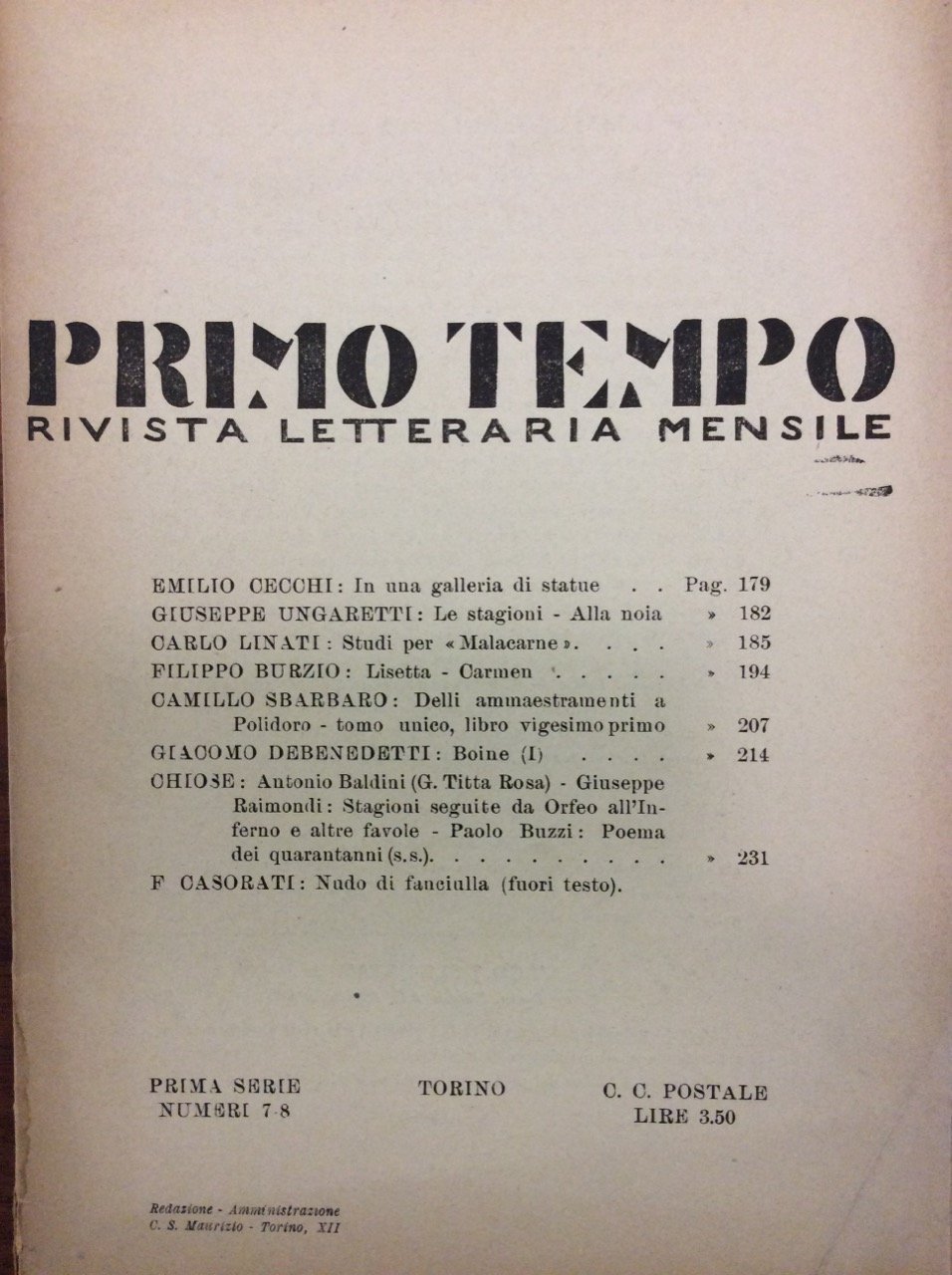 In-8 gr., brossura editoriale (etichetta al dorso; macchie e tracce d'uso), pp. (2), da p. 179 a p. 240,(2), con 1 tav. in bianco e nero fuori testo che riproduce l'opera di F. Casorati, Nudo di donna. Di questa ricercata e importante rivista dl carattere letterario, offriamo il n. 7-8 (del 1923). Contiene: Emilio Cecchi, "In una galleria di statue" - G. Ungaretti, "Le stagioni / Alla noia" - C. Linati, "Studi per Malacarne" - F. Burzio, "Lisetta - Carmen" - C. Sbarbaro, "Delli ammaestramenti a Polidoro - tomo unico, libro vigesimo primo" - G. Debenedetti, "Boine (I)" - Chiose: A. Baldini, (G. Titta Rosa) - Giuseppe Raimondi: Stagioni seguite da Orfeo all'Inferno e altre favole - Paolo Buzzi: Poema dei quarantanni. Ben conservato.