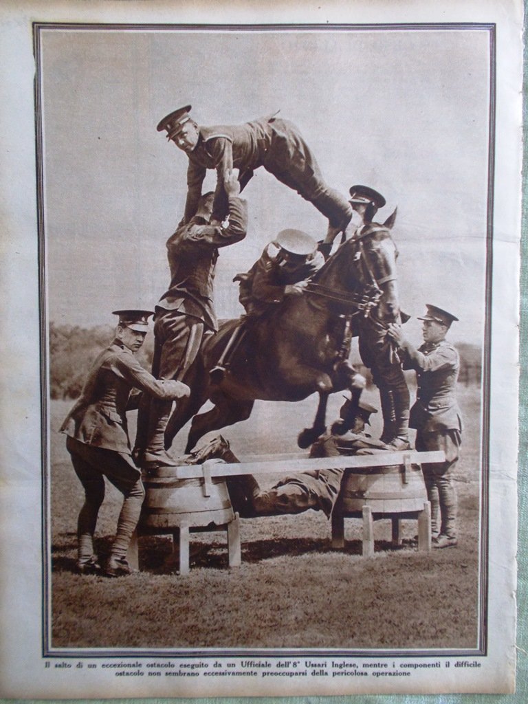 Il salto di un eccezionale ostacolo eseguito da un Ufficiale dell' 8° Ussari Inglese, mentre i componenti il difficile ostacolo non sembrano eccesivamente preoccuparsi della pericolosa operazione