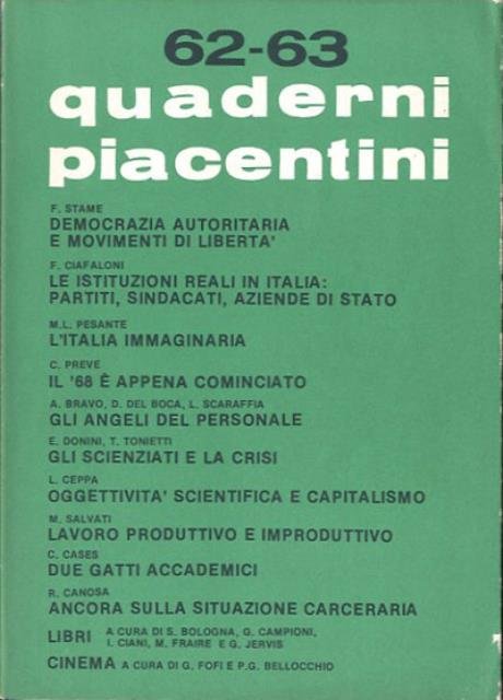222 p. ; 22 x 15 cm. "Quaderni piacentini" è stata una rivista di dibattito politico e culturale fondata a Piacenza nel 1962; pubblicata con cadenza bimestrale fino al 1980 e in una seconda serie fino al 1985, fu diretta da P. Bellocchio, quindi (dal 1971) da un comitato di direzione. Fu per molti anni uno dei punti di riferimento teorico-politico della cosiddetta nuova sinistra, anticipando le tematiche del movimento studentesco del 1968 e sostenendo, in ambito culturale, una linea di critica intransigente alla società capitalistica. Tra i collaboratori, C. Cases, F. Fortini, G. Giudici, A. Berardinelli, G. Jervis, E. Masi. Brossura editoriale, coperta in cartoncino flessibile colorato (verde), titolo impresso in bianco al piatto. Codice libreria 4098.