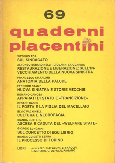 160 p. ; 22 x 15 cm. "Quaderni piacentini" è stata una rivista di dibattito politico e culturale fondata a Piacenza nel 1962; pubblicata con cadenza bimestrale fino al 1980 e in una seconda serie fino al 1985, fu diretta da P. Bellocchio, quindi (dal 1971) da un comitato di direzione. Fu per molti anni uno dei punti di riferimento teorico-politico della cosiddetta nuova sinistra, anticipando le tematiche del movimento studentesco del 1968 e sostenendo, in ambito culturale, una linea di critica intransigente alla società capitalistica. Tra i collaboratori, C. Cases, F. Fortini, G. Giudici, A. Berardinelli, G. Jervis, E. Masi. Brossura editoriale, coperta in cartoncino flessibile colorato (giallo), titolo impresso in rosso al piatto. Codice libreria 4102.