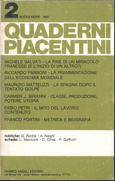 Quaderni piacentini. N. 2, nuova serie, 1981.
