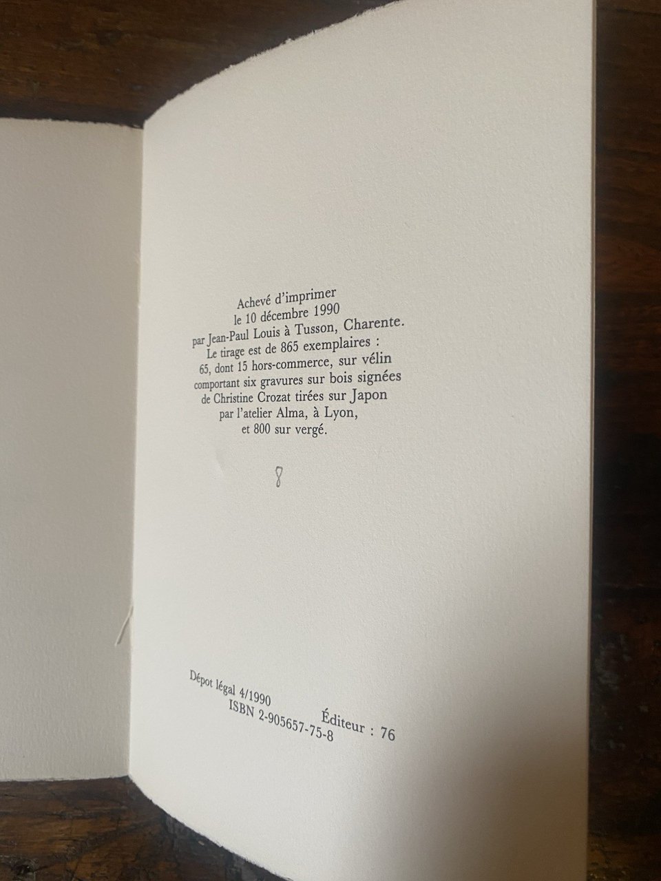Tiratura di 865 esemplari numerati I primi15 con sei incisioni originali firmate da Christine Crozat Esemplare numero 8 In 16° brossura editoriale pp. 52 I° edizione Firma di appartenenza all'occhiello Buono stato