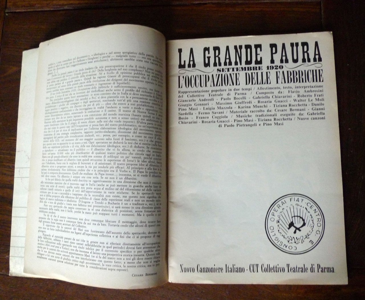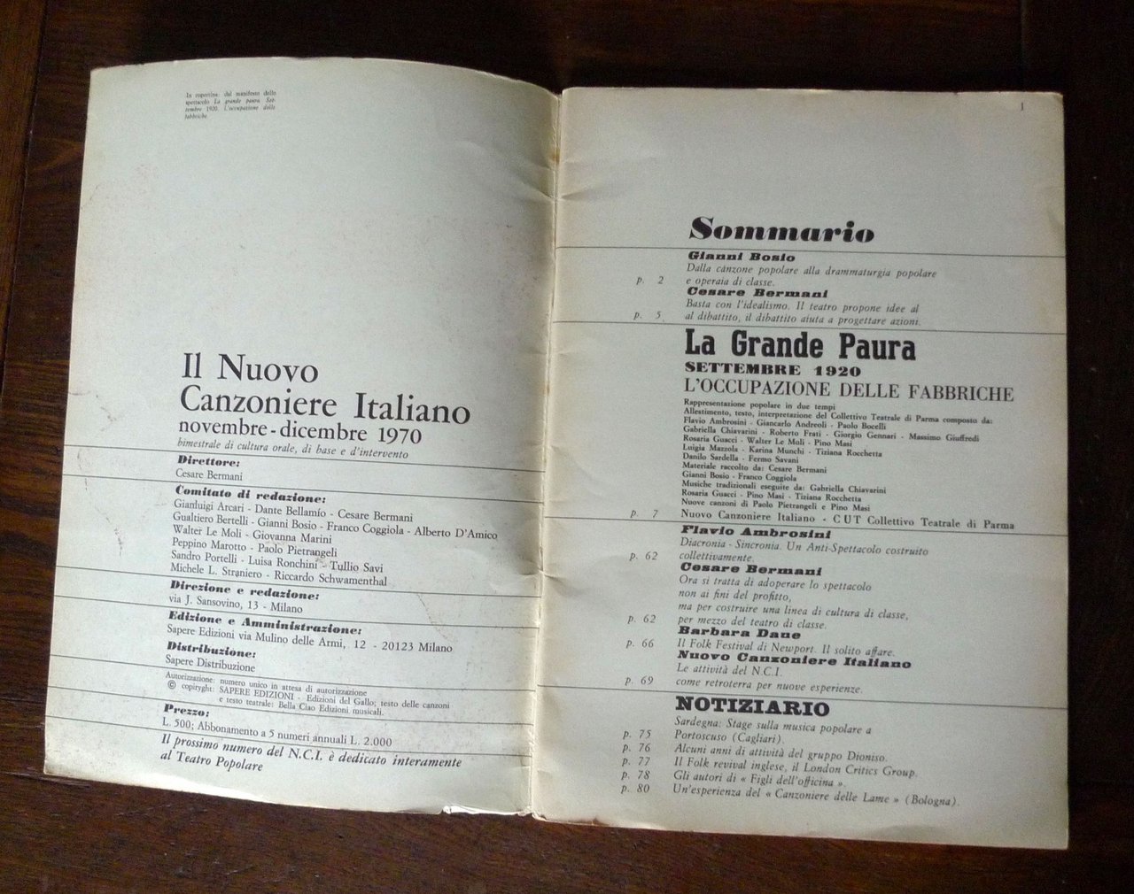 IL NUOVO CANZONIERE ITALIANO Novembre-Dicembre 1970Bimestrale di cultura orale, di base e d'intervento.Direttore: Carlo Bermani.LA GRANDE PAURA / SETTEMBRE 1920.L'OCCUPAZIONE DELLE FABBRICHE.Sapere Edizioni / Edizioni del Gallo, Milano 1970,numero unico in attesa di autorizzazione,brossura, rilegatura con punto metallico,33x21 cm., pp.80,illustrazioni in bianco e nero,peso: g.350cod.9973CONDIZIONI DELLA RIVISTA: molto buone,imperfezioni alla copertina,etichetta di libreria all'ultima di copertina,pagine leggermente ingiallite