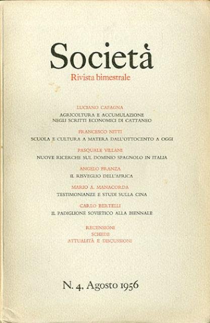 1 fasc. (pp. 623-818), [4] p. di tav. : ill. ; 22 x 15 cm. Sommario del n. 4 (agosto 1956): Luciano Cafagna, «Agricoltura e accumulazione negli scritti economici di Cattaneo»; Francesco Nitti, «Scuola e cultura a Matera dall'ottocento a oggi»; Pasquale Villani, «Nuove ricerche sul dominio spagnolo in Italia»; Angelo Franza, «Il risveglio dell'Africa»; Mario M. Manacorda, «Testimonianze e studi sulla Cina»; Carlo Bertelli, «Il padiglione sovietico alla Biennale»; Recensioni, schede, attualità e discussioni. «Società» è stata una rivista di politica e cultura, a periodicità trimestrale, fondata a Firenze nel 1945 dall'archeologo Ranuccio Bianchi Bandinelli e da un gruppo di intellettuali comunisti composto da Romano Bilenchi, Marta Chiesi e Cesare Luporini. La rivista cessa le pubblicazioni nel 1961. Brossura editoriale, coperta in cartoncino flessibile di colore grigio, titolo impresso al piatto e al dorso. All'interno quattro pagine di tavole illustrate (b/n) fuori testo su carta patinata lucida. . Codice libreria 6790.