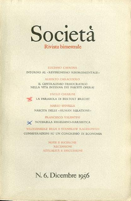 1 fasc. (pp. 1015-1202) ; 22 x 15 cm. Sommario del n. 6 (dicembre 1956): Luciano Cafagna, «Intorno al "revisionismo risorgimentale"; Alberto Caracciolo, «Il centralismo democratico nella vita interna dei partiti politici»; Paolo Chiarini, «La parabola di Bertolt Brecht»; Mario Spinella, Nascita delle "human relations"»; Francesco Valentini, «Noterella hegeliano-marxista», Wlodzimierz Brus e Stanislaw Raczkowski, «Considerazioni su un congresso di economia». Note e ricerche, recensioni, attualità e discussioni. «Società» è stata una rivista di politica e cultura, a periodicità trimestrale, fondata a Firenze nel 1945 dall'archeologo Ranuccio Bianchi Bandinelli e da un gruppo di intellettuali comunisti composto da Romano Bilenchi, Marta Chiesi e Cesare Luporini. La rivista cessa le pubblicazioni nel 1961. Brossura editoriale, coperta in cartoncino flessibile di colore grigio, titolo impresso al piatto e al dorso. Qualche leggera sottolineatura a matita, per il resto esemplare integro. Codice libreria 6792.
