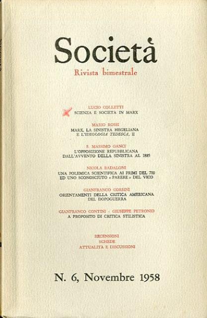 1 fasc. (pp. 1025-1232) ; 22 x 15 cm. Sommario del n. 6 (novembre 1958): Luciano Cafagna, «Agricoltura e accumulazione negli scritti economici di Cattaneo»; Francesco Nitti, «Scuola e cultura a Matera dall'ottocento a oggi»; Pasquale Villani, «Nuove ricerche sul dominio spagnolo in Italia»; Angelo Franza, «Il risveglio dell'Africa»; Mario M. Manacorda, «Testimonianze e studi sulla Cina»; Carlo Bertelli, «Il padiglione sovietico alla Biennale»; Recensioni, schede, attualità e discussioni. «Società» è stata una rivista di politica e cultura, a periodicità trimestrale, fondata a Firenze nel 1945 dall'archeologo Ranuccio Bianchi Bandinelli e da un gruppo di intellettuali comunisti composto da Romano Bilenchi, Marta Chiesi e Cesare Luporini. La rivista cessa le pubblicazioni nel 1961. Brossura editoriale, coperta in cartoncino flessibile di colore grigio, titolo impresso al piatto e al dorso. Qualche leggero segno del tempo, piccole sottolineature a matita, per il resto esemplare integro. Codice libreria 6796.