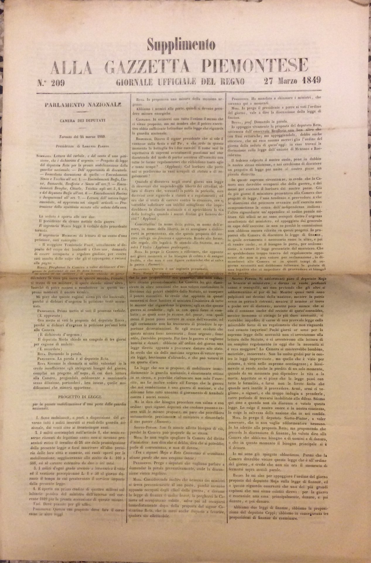 SUPPLIMENTO ALLA GAZZETTA PIEMONTESE - N. 209, 27 MARZO 1849. - Giornale Ufficiale del Regno.