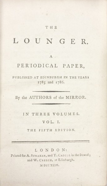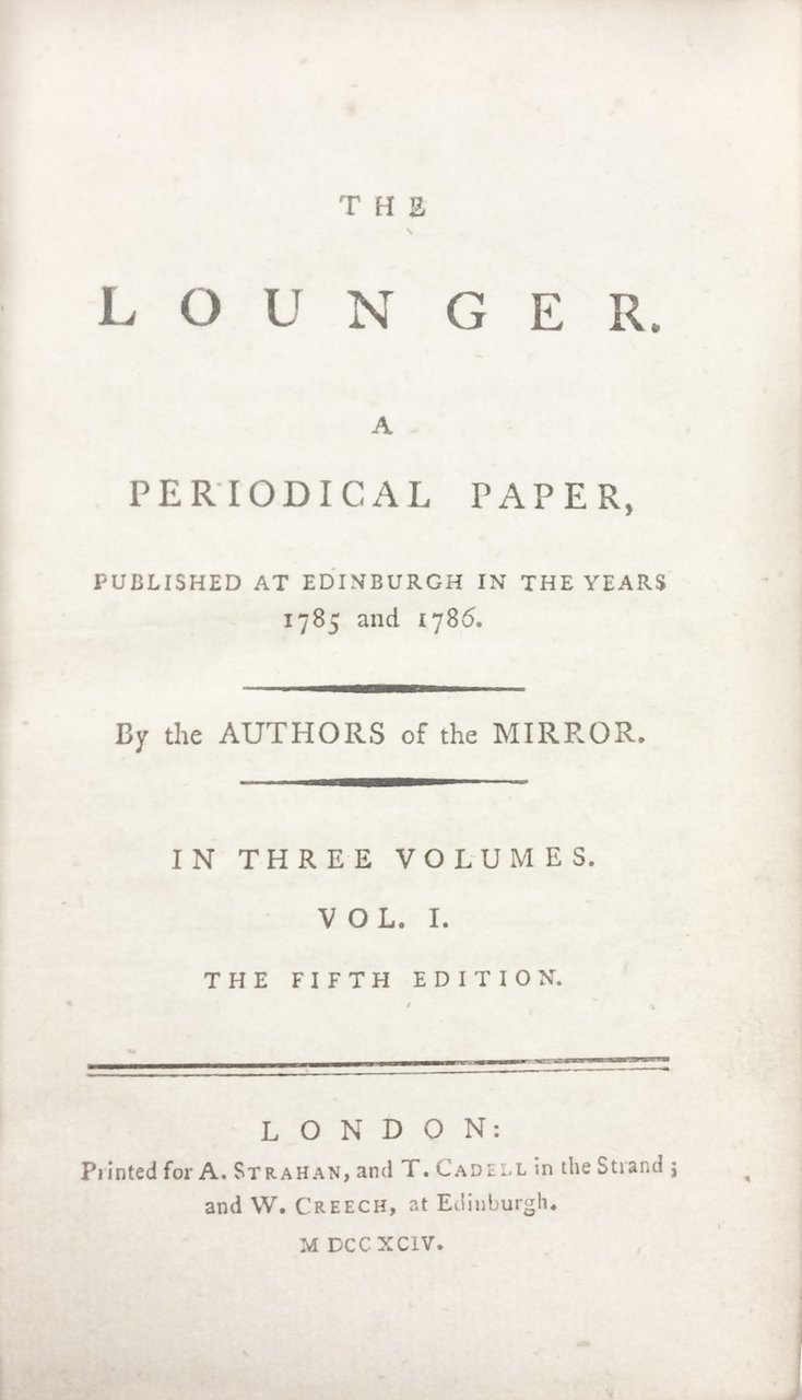 THE LOUNGER. - A periodical paper, published at Edinburgh in the years 1785 and 1786 by the authors of the Mirror.
