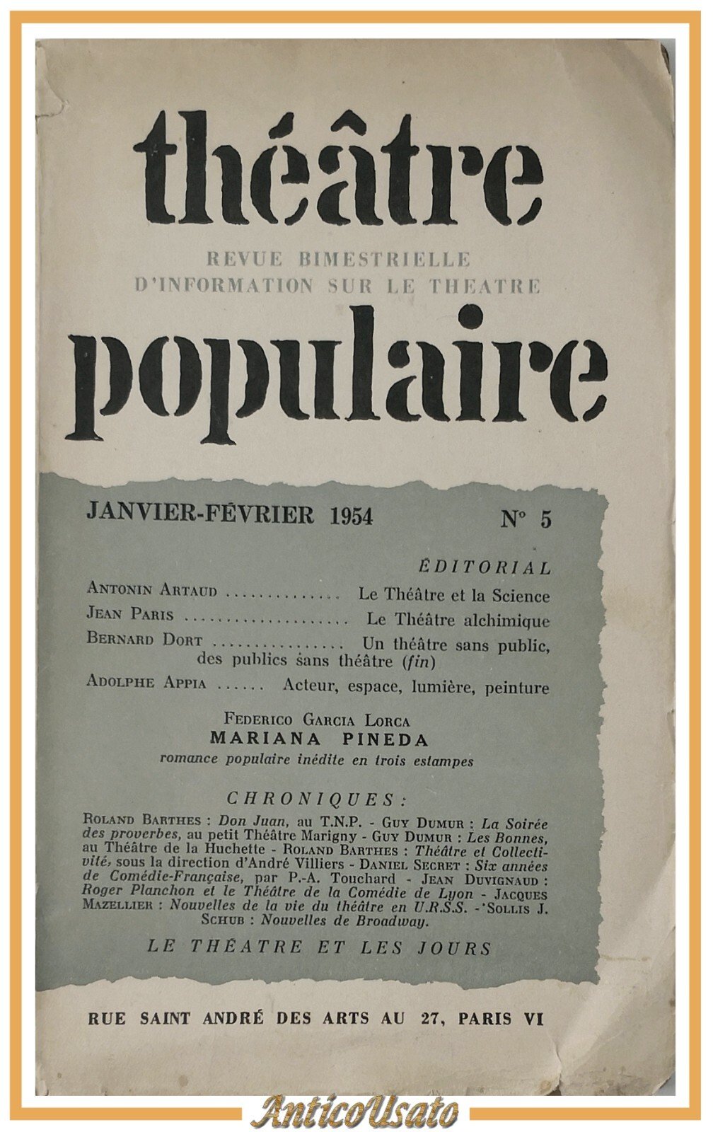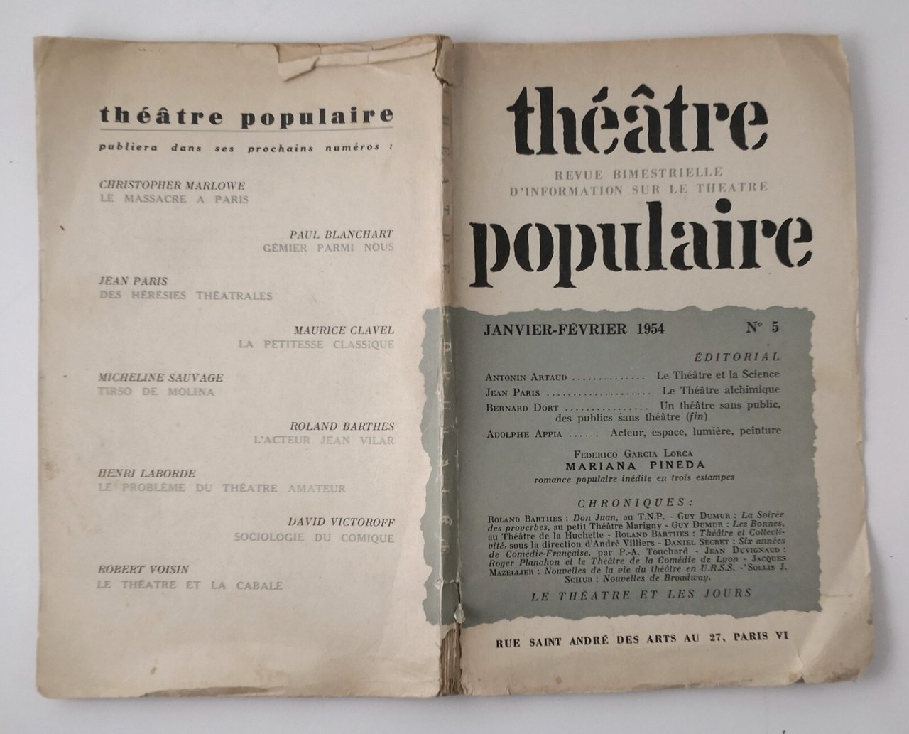 THEATRE POPULAIRE Numero 5 1954 Garcia Lorca Mariana Pineda Rivista Barthes