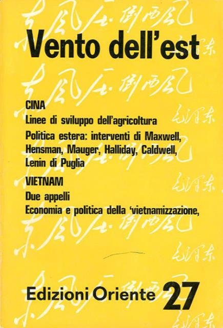 90 p. ; 24 x 17 cm. La rivista «Vento dell'Est» nasce nel febbraio del 1965 con l'intento di far conoscere il materiale teorico d'attualità proveniente dalla Cina comunista ma con la volontà di produrre elaborazioni, studi e ricerche riguardanti un più vasto arco di problematiche politiche e sociali. «Vento dell'Est» prendeva il nome da una nota frase di Mao Tse-tung pronunciata nel 1957: "il vento dell'Est prevale sul vento dell'Ovest". Cessa le pubblicazioni con il n. 51-52 nel febbraio 1979. Direttore responsabile: Maria Regis.Comitato di redazione: Mario Cannella, Filippo Coccia, Mireille De Gouville, Edoarda Masi e Maria Regis. Brossura editoriale, coperta in cartoncino flessibile colorato e plastificato lucido. Codice libreria 4236.