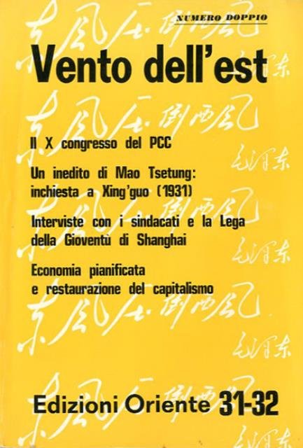 189 p. ; 24 x 17 cm. La rivista «Vento dell'Est» nasce nel febbraio del 1965 con l'intento di far conoscere il materiale teorico d'attualità proveniente dalla Cina comunista ma con la volontà di produrre elaborazioni, studi e ricerche riguardanti un più vasto arco di problematiche politiche e sociali. «Vento dell'Est» prendeva il nome da una nota frase di Mao Tse-tung pronunciata nel 1957: "il vento dell'Est prevale sul vento dell'Ovest". Cessa le pubblicazioni con il n. 51-52 nel febbraio 1979. Direttore responsabile: Maria Regis.Comitato di redazione: Mario Cannella, Filippo Coccia, Mireille De Gouville, Edoarda Masi e Maria Regis. Brossura editoriale, coperta in cartoncino flessibile colorato e plastificato lucido. Codice libreria 4239.