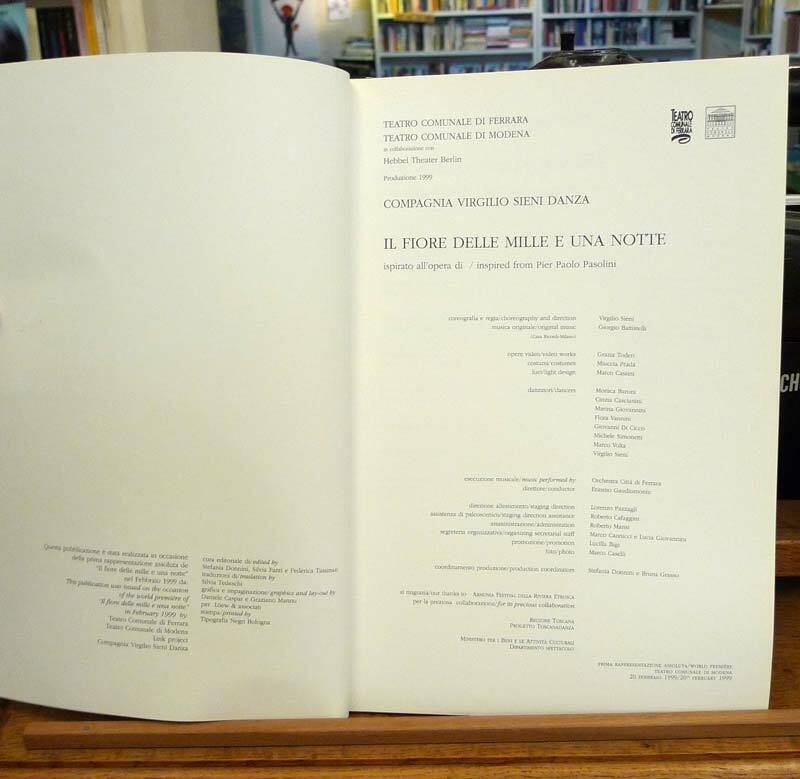 Compagnia Virgilio Sieni,IL FIORE DELLE MILLE E UNA NOTTE,ispirato all'opera di Pier Paolo PasoliniTeatro Comunale di Ferrara, Teatro comunale di Modena, Link Project, Bologna 1999, prima edizione,brossura, 22x33 cm., pp. 64,testi in italiano ed inglese,peso: g. 441cod. 2580