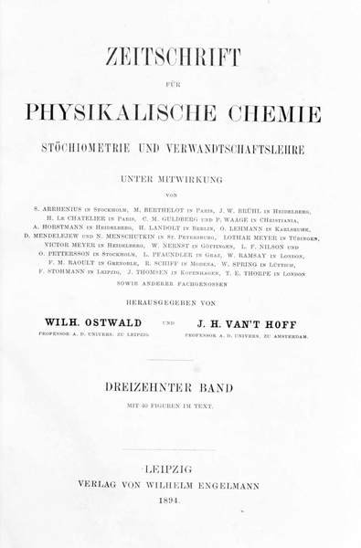 In-8 p., 6 volumi, mz. tela coeva. Di questa rivista scientifica, a cura di Wilhelm OSTWALD e Jacobus VAN'T HOFF sono disponibili 3 annate complete (rileg. a semestri): 1892 - 1893 - 1894. Nell'annata 1892 (primo semestre) sono contenuti due importanti articoli di Max Planck "in prima edizione": Notiz zur Theorie der Diffusion und Elektrolyse, pp. 347-348 e Erwiderung auf einen von Herrn Arrhenius erhobenen Einwand, pp. 636-637. In this paper (Erwiderung..) Planck responds to a paper by Svante Arrhenius "Uber die Gultigkeit des Beweises von Herrn Planck fur das van't Hoff'sche Gesetz" published in the same journal (pp. 330-334)". Cfr. Catalogue 258, n. 17, Interlibrum, Vaduz, "Max Planck".Esemplare ben conservato.
