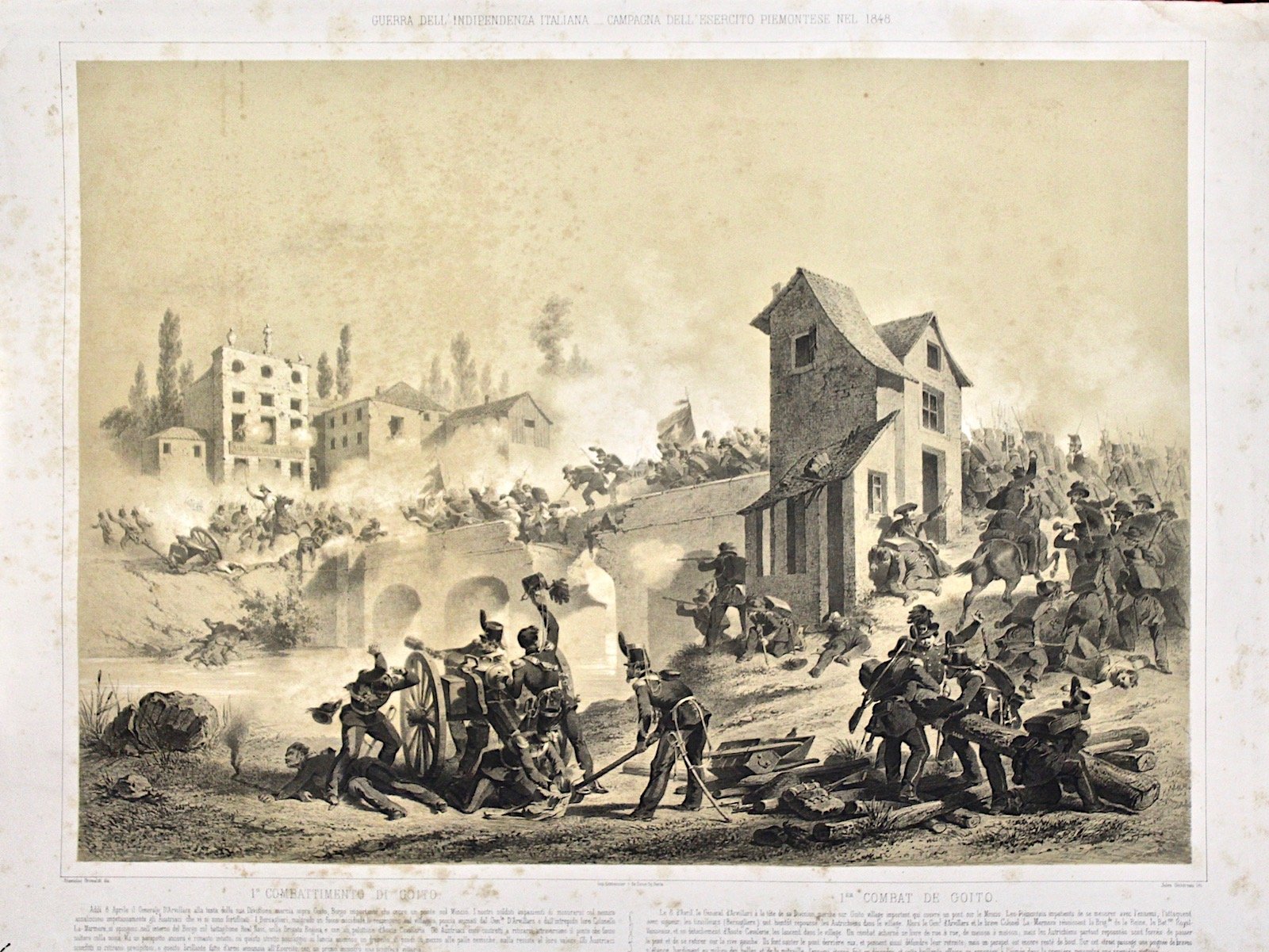 Litografia, mm 400x550 (immagine). Tratta da "Guerra dell'Indipendenza italiana, campagna dell'esercito piemontese nel 1848". In basso il testo descrittivo in italiano e in francese. Carta uniformemente ingiallita con fioriture marginali, in alto margine rifilato in modo un po' irregolare.