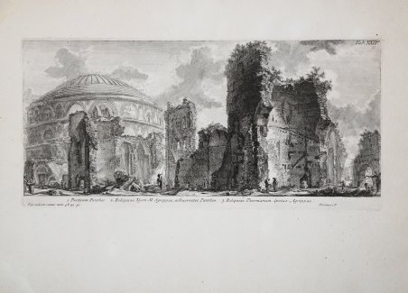 Acquaforte, bulino e puntasecca, circa 1762, firmata in lastra in basso. Magnifica prova, impressa su carta vergata coeva con margini, in eccellente stato di conservazione. Tavola tratta da ' Il Campo Marzio dell’Antica Roma opera di G.B. Piranesi socio della Real Società degli Antiquari di Londra. Sebbene pubblicata solo nel 1762 questa fondamentale opera, che appare come una delle più complesse del Piranesi, veniva già annunciata dall’artista nelle ' Antichità Romane ' (1756) ' delle quali, secondo Focillon, può essere considerata come il quinto tomo. La vicenda del Campo Marzio si intrecciano con l’amicizia con lo scozzese Robert Adam, al quale l’opera è dedicata. Adam era giunto a Roma nel 1755 e ben presto aveva conosciuto Piranesi, forse per mezzo del comune amico Charles-Louis Clerisseau, trovando nella comune passione archeologica la base di una reciproca stima, che continuò anche dopo il ritorno dell’architetto Londra. Fu proprio Adam che, durante le ricognizioni dei resti dei monumenti del Campo Marzio, suggerì al Piranesi l’idea di realizzare una mappa dell’intera area, che inizialmente doveva essere inclusa nelle ' Antichità, ' e poi finì per costituire la base di un progetto ben più ambizioso, dando alla luce questa importante opera. Negli scritti iniziali l’autore annuncia lo scopo di questo lavoro, affermando la volontà di voler tracciare la storia di questa vasta area compresa tra il Tevere ed i colli, cercando di ricostruirne la conformazione ed il volto. Egli sottolinea la difficoltà di tale lavoro di ricostruzione, poiché l’antico Campo Marzio ha coinciso con l’area più intensamente popolata e riedificata della città dal medioevo all’epoca attuale, non nascondendo il margine di ipotetica insito nell’opera. Il risultato è che l’attendibilità dei risultati rimane quanto mai problematica, sia per la pionieristica ricerca archeologica del tempo, sia per la carica visionaria che porta l’artista e l’architetto a superare di slancio i limiti della realtà storica progettando il passato in funzione del presente, portando il genio artistico a prevalere di gran lunga sull’archeologo, conferendo senso e vigore a tutta l’opera. Bibliografia H. Focillon, ' Giovan Battista Piranesi 1720-1778 ' (1918): n. 347; J. Wilton-Ely, ' Giovan Battista Piranesi, The complete etchings ' (1994): n. 480. Etching, engraving and drypoint, circa 1762, signed in plate at the bottom. Magnificent proof, printed on contemporary laid paper, in excellent condition. Plate taken from ' Il Campo Marzio dell’Antica Roma opera di G.B. Piranesi socio della Real Società degli Antiquari di Londra. Although published only in 1762, this fundamental work, which appears to be one of Piranesi's most complex, had already been announced by the artist in the ' Antichità Romane ' (1756) of which, according to Focillon, it can be considered as the fifth volume. The story of the Campus Martius is intertwined with the friendship with the Scotsman Robert Adam, to whom the work is dedicated. Adam had arrived in Rome in 1755 and soon got to know Piranesi, perhaps through their mutual friend Charles-Louis Clerisseau, finding in their common archaeological passion the basis of a mutual esteem, which continued even after the architect's return to London. It was Adam himself who, during the reconnaissance of the remains of the monuments of the Campus Martius, suggested to Piranesi the idea of creating a map of the entire area, which initially was to be included in the Antiquities, and then ended up forming the basis of a much more ambitious project, giving birth to this important work. In the initial writings the author announces the purpose of this work, stating the will to trace the history of this vast area between the Tiber and the hills, trying to reconstruct the conformation and the face. He underlines the difficulty of this reconstruction work, since the ancient Campus Martius coincided with the most intensely populated and rebuilt area of the city from the Middle Ages to the present time, not hiding the margin of hypothetic inherent in the work. The result is that the reliability of the results remains very problematic, both for the pioneering archaeological research of the time, and for the visionary charge that leads the artist and the architect to overcome the limits of historical reality designing the past in function of the present, bringing the artistic genius to prevail by far on the archaeologist, giving sense and vigor to the whole work. Bibliografia H. Focillon, ' Giovan Battista Piranesi 1720-1778 ' (1918): n. 347; J. Wilton-Ely, ' Giovan Battista Piranesi, The complete etchings ' (1994): n. 480. Cfr.