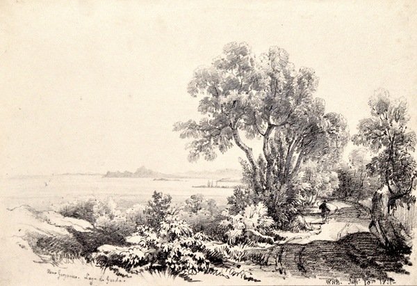 Disegno a lapis su carta di mm 185x267 montata su cartoncino, raffigurante un paesaggio campestre presso Gargnano, località gardesana del litorale bresciano. A destra si scorge una figura a passeggio tra gli alberi della riva, a sinistra il Lago di Garda. L'esemplare riporta il monogramma WNB. L'autore (Thieme-Becker V, 269), che viaggiò in Italia fra il 1831 e il 1832, fu valido pittore paesaggista ed espose più volte le proprie opere alla Royal Academy. Dai suoi disegni fu eseguito anche un libro su Cintra nel 1836. <BR>