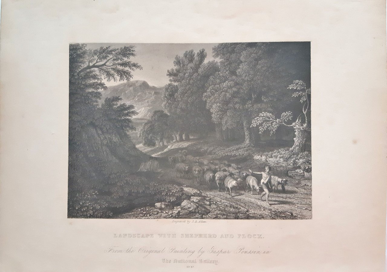 Stampa antica tratta da un dipinto di Gaspard Dughet, solitamente chiamato Gaspard Poussin, con un pastore con il suo gregge di pecore in viaggio lungo una strada di campagna. L'incisione riporta nella parte inferiore le indicazioni dell' autore del dipinto dal quale è stata tratta e quelle dell'editore.