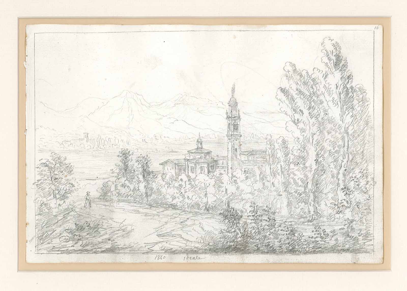 Disegno n° 16 raffigurante uno studio di un paese ideale, attribuito al famoso pittore bergamasco Pietro Ronzoni (Serina 1781 - Bergamo 1862). Opera pubblicata in "La Bergamasca / e dintorni / di / Pietro Ronzoni" di Lanfranco Ravelli critico d'arte bergamasco. Pubblicazione di 60 disegni edita sia dalla Banca di Bergamo che dalla Galleria Previtali di Bergamo. Montato in elegante cornice di ciliegio chiaro della misura di cm. 34x44. Al disegno è allegato uno dei volumi prima citati su cui è stato pubblicato