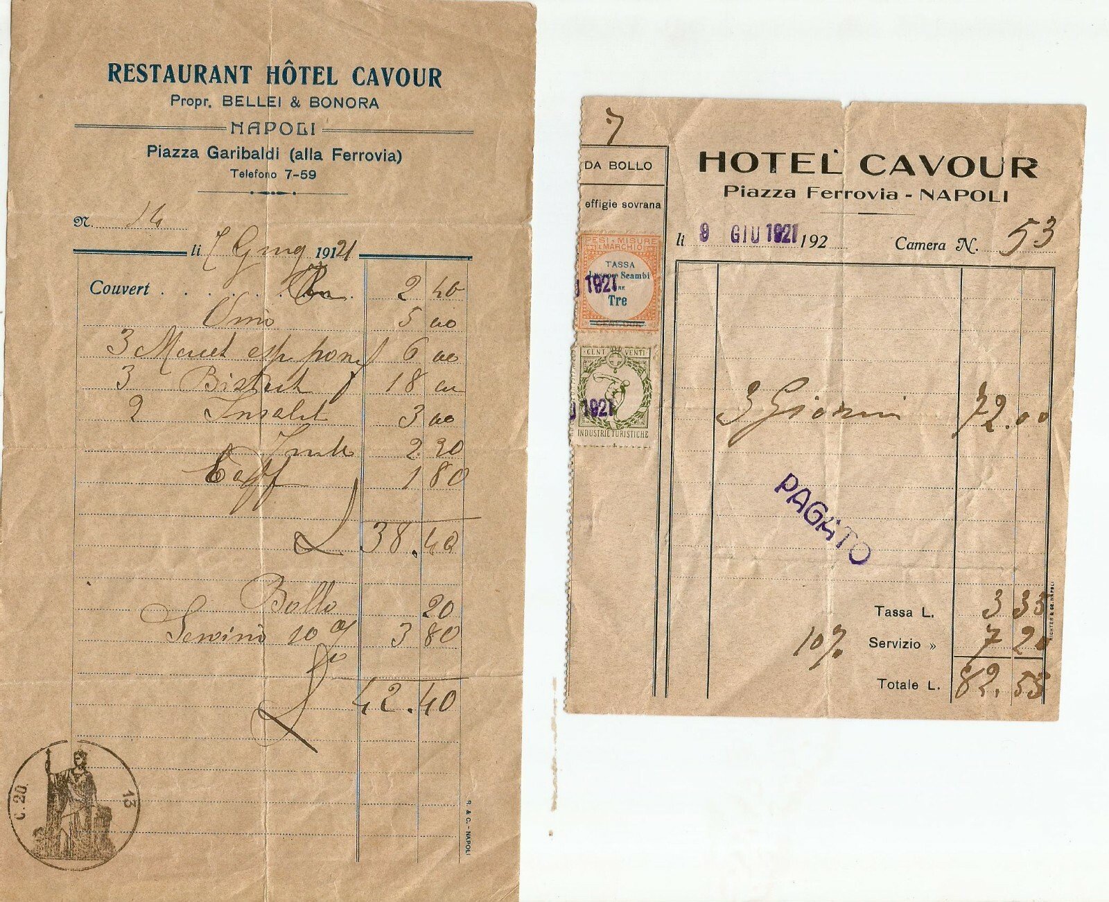 2 Interessanti ricevute fiscali, datate 2 e 8 giugno 1921 dell'Hotel Cavour, Piazza Garibaldi (alla ferrovia), Napoli. Sulla ricevuta più piccola due marche da bollo, uno della tassa lusso e scamni da lire 3 e una delle industrie turistiche da 20 centesimi.dimensioni 12 x 14,5 cm e 12,5 x 22 cm. . Stato di conservazione: buono (carta ingiallita, pieghe orizzontale e verticale, strappetti, piccole mancanze e piegoline ai margini).