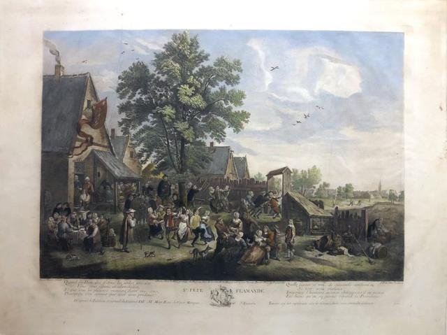 Paris, Le Bas, 1830 circa. Incisione in rame all'acquaforte, recente coloritura a mano, cm 50 x 68 circa (alla lastra), 60 x 80 (il foglio). Titolo, dedica e cartiglio al margine inferiore. Da un disegno del Teniers e incisa dal Le Bas, scena animata da una miriade di personaggi: un intero villaggio in festa, dove uomini, donne e bambini, all'ombra di grandi alberi nei pressi di un villaggio, mangiano, bevono, danzano e suonano allegramente. Scena di tipico gusto e ambiente fiammingo, assai decorativa. Una piega in alto a sinistra e una in basso a destra non disturbano questa bella mise en scéne, in bella coloritura e a pieni margini, buono lo stato di conservazione. .