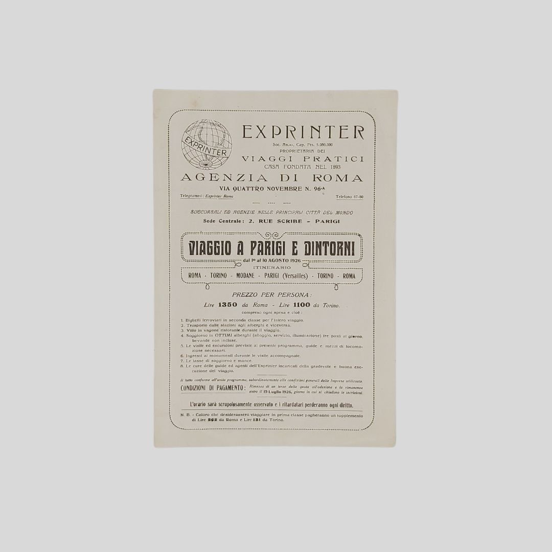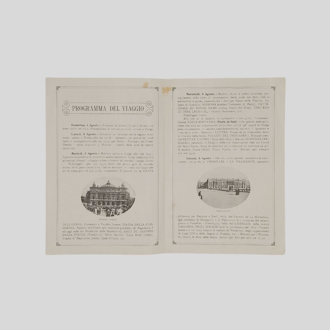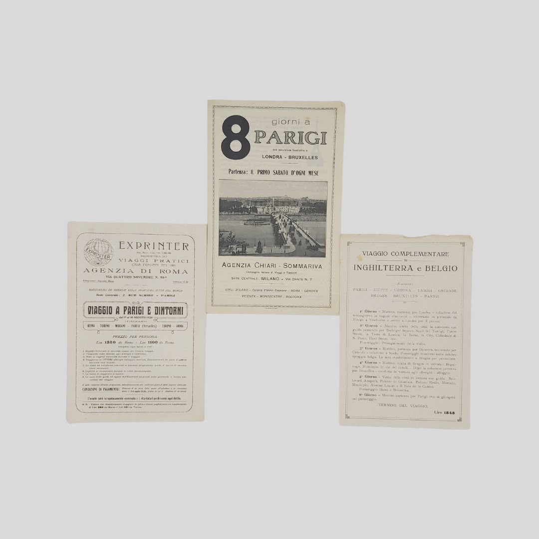 Agenzia Chiari-Sommariva, Milano, Como, F.lli Ganzetti, s.d. (anni ’20), pieghevole a due ante (mm 225×143). Exprinter, Viaggi pratici. Roma, I.G.A.P., s.d. (1926). Viaggio a Parigi e dintorni dal 1° al 10 agosto 1926. Pieghevole a due ante (cm 211×143) con foglio aggiunto stampato al solo recto. Naturali tracce d’uso.