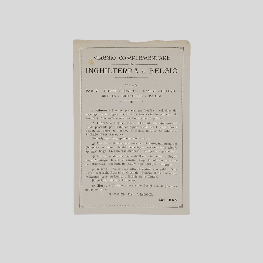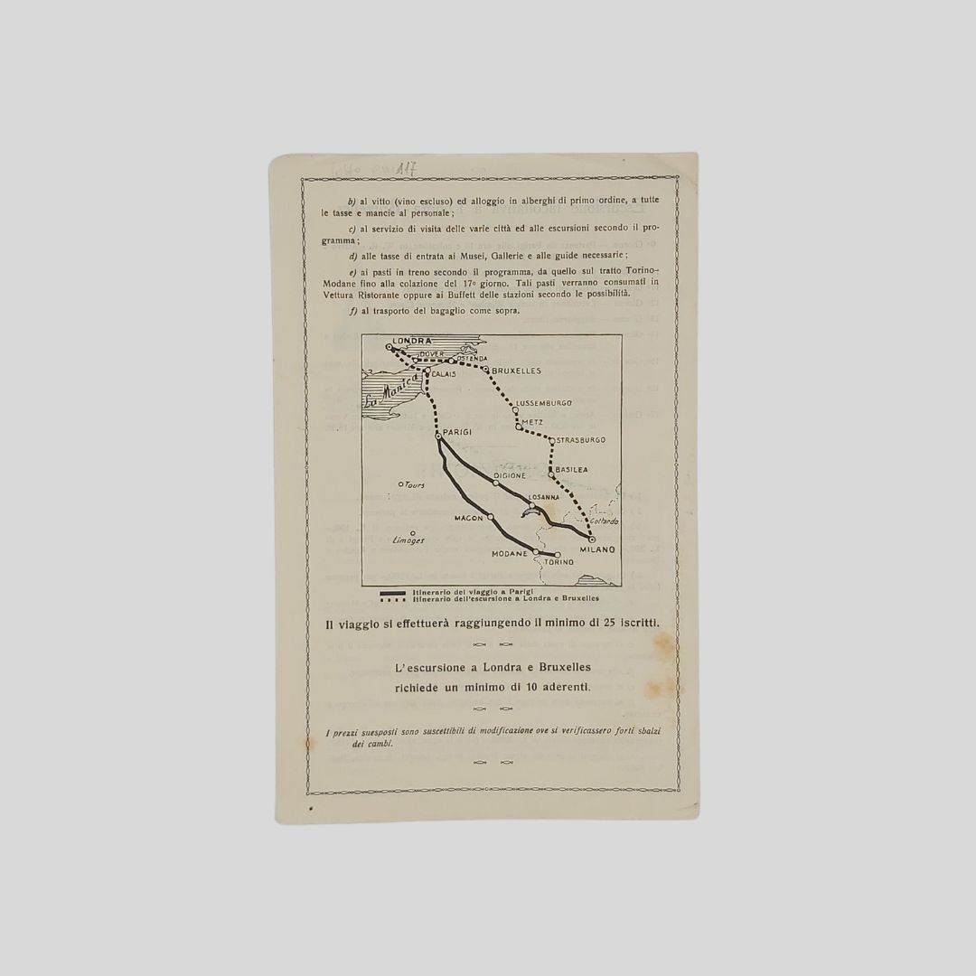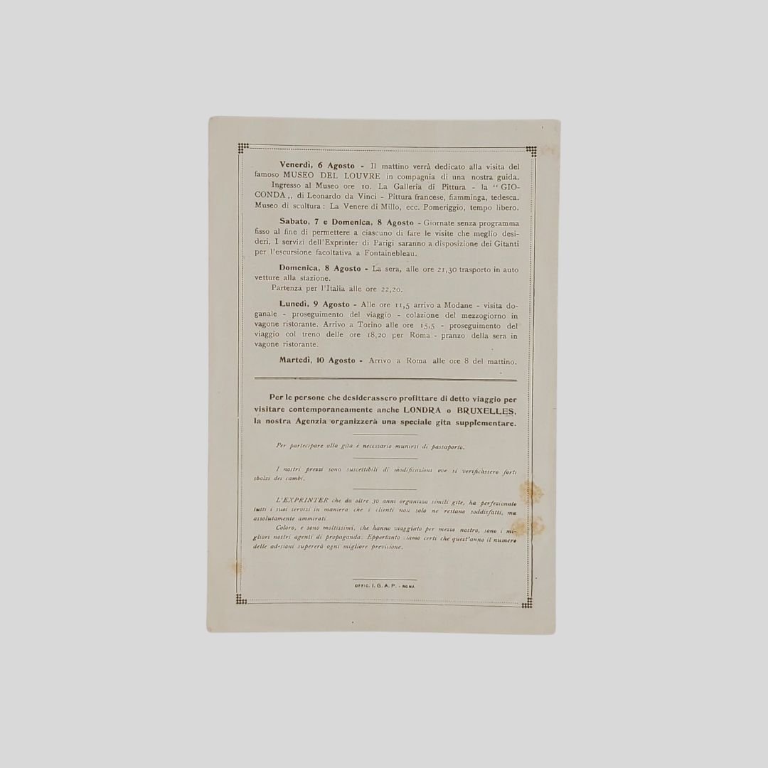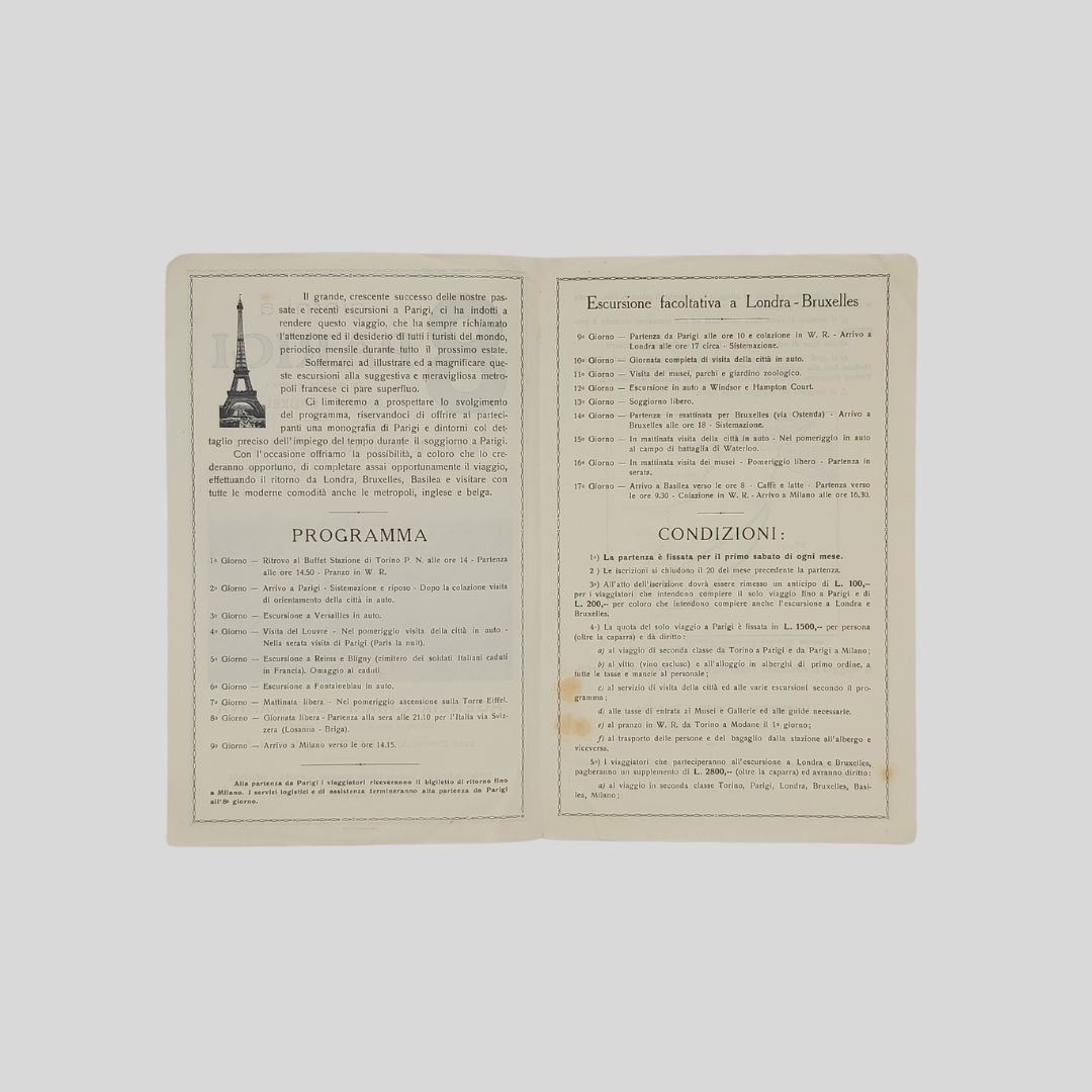Agenzia Chiari-Sommariva, Milano, Como, F.lli Ganzetti, s.d. (anni ’20), pieghevole a due ante (mm 225×143). Exprinter, Viaggi pratici. Roma, I.G.A.P., s.d. (1926). Viaggio a Parigi e dintorni dal 1° al 10 agosto 1926. Pieghevole a due ante (cm 211×143) con foglio aggiunto stampato al solo recto. Naturali tracce d’uso.