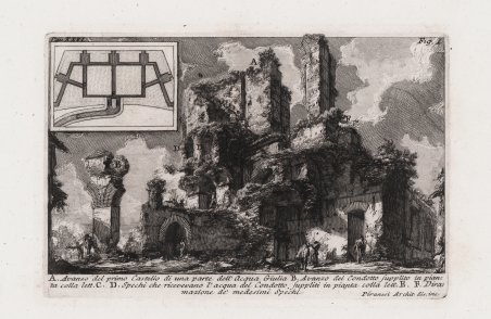 Acquaforte e bulino, 1756 circa, firmata in lastra in basso a destra. Dalla serie Le Antichità Romane. Meravigliosa prova, ricca di toni, impressa a inchiostro bruno su carta vergata coeva, con pieni margini ed in perfetto stato di conservazione. Opera tratta dalla prima edizione, pubblicata a Roma nel 1756 nella stamperia di Angelo Rotili a Palazzo Massimo alle Colonne, dai signori Bouchard e Gravier, librai e mercanti in Roma con sede presso San Marcello al Corso. La raccolta conteneva un ritratto del Piranesi, inciso da Felice Polanzani, e recava una dedica a James Caulfield conte di Charlemont, dedica poi eliminata in seguito ad un litigio. Di questa edizione originale, che venne alla luce nel maggio del 1756, sono note tre diverse tirature, connesse con le vicende del litigio con lord Charlemont, vicende documentate dal Piranesi stesso nelle sue Lettere di Giustificazione del 1757. Le diverse tirature sono riconoscibili tra loro proprio nel frontespizio del primo tomo, quello originariamente dedicato al nobile inglese, che successivamente si presenta con dedica e stemma araldico abraso, quindi con l’aggiunta di una dedica dell’autore Aevo Suo Posteri set Utilitari Publicae. Henry Focillon, nel suo saggio del 1918, suppone che il Piranesi prepari ed incida le tavole per l’opera tra il 1750 ed il 1756, tuttavia, elementi architettonici fanno risalire alcune al 1746. In realtà le tavole più antiche utilizzate nella raccolta risalgono probabilmente ad anni ancora precedenti, come sembra suggerire sia l’estrema complessità dell’opera, legata ad un lunghissimo lavoro di preparazione e ricerca, sia l’oscillazione stilistica riscontrabile comparando le varie tavole. Ad ogni modo, la grandiosità delle Antichità Romane del Piranesi non sta solamente nel grande lavoro grafico prodotto dall’artista: l’opera risulta infatti fondamentale come innovazione metodologica nel settore dell’archeologia a lei contemporanea, con l’utilizzo di scritti che sono essenziali per comprendere il pensiero dell’autore e l’innovazione del metodo piranesiano. Si può quindi sostenere, come giustamente fa notare il Focillon, che l’artista veneziano fondi l’archeologia moderna. Questa innovazione comporta, però, un enorme stacco e una grande divergenza con il pensiero e la cultura ufficiale ed accademica del periodo - di derivazione anglosassone - causando enormi polemiche di cui Piranesi fu bersaglio, e il fiorire di una negativa aneddotica intorno alla sua persona, il cui scopo era quello di ristabilire l’egemonia minacciata della cultura “classica”. Il principale pensiero espresso nelle Antichità Romane consiste nel documentare e conservare in effige un patrimonio monumentale che andava di giorno in giorno sgretolandosi, linea di condotta che andava contro l’atteggiamento culturale di amatori ed antiquari, il cui piacere era puramente estetico, non disdegnando all’occorrenza, l’asporto di frammenti anche vistosi di antichità a titolo di puro collezionismo o alla stregua di souvenir. La principale novità della sua impostazione consiste nell’unificare in un solo momento le operazioni di scavo, di rilievo, le indagini strutturali e la misurazione con lo studio delle fonti letterarie, a cui egli fa riferimento diretto. Questo momento di unificazione è rappresentato dallo studio topografico, che unito alla tecnica di rilievo, alla conoscenza dei materiali e delle tecniche antiche, allo scavo ed al sopralluogo dava luce all’archeologia, ovvero lo studio della storia antica. Etching with engraving, 1756, signed at the bottom margin. From the Antichità Romane, first edition by the French publisher Bouchard and Gravier in 1756. A great impression, printed with brown ink on contemporary laid, strong, paper, with margins, perfect conditions. The first edition of this work, in four volumes, was published in Rome in 1756 at the printing-works of Angelo Rotili at the Massimo alle Colonne Palace, by Bouchard and Gravier, book-dealers and tradesmen located in Rome near the church of St. Marcel at the Via del Corso. This collection included a portrait of Piranesi, engraved by Felice Porziani, and a dedication to James Caulfield, count of Charlemont. This dedication was later abolished in the aftermath of a quarrel, described by Piranesi in his Lettere di Giustificazione [Letters of Justification] (1757), which also gave rise to three different versions of this first original edition (May 1756). These different versions are distinguishable from the title-page of the first volume, which initially was dedicated to the Irish aristocrat, then exhibited a cancelled dedication and coat of arms and, finally, bore a Latin motto written by the artist "Aevo Suo Posteri set Utilitari Publicae". Henry Focillon, in his 1918 treatise, presumed that Piranesi prepared and engraved the plates for this collection between 1750 and 1756, although some architectural features could have a few of them dating back to 1746. Actually, the oldest plates included in this collection probably date back even further, as suggested by the extraordinary complexity of this work, due to a prolonged phase of preparation and research, together with the stylistic alterations which can be observed by comparing the different plates. The magnificence of Piranesi's Antichità Romane, however, is not only in the artist's large graphic output. Indeed, this work is of primary importance from the standpoint of methodological innovation within the framework of contemporary archaeology, with the utilisation of texts which are of essential importance for the comprehension of the author's ideas and of the innovations implied in Piranesi's methodology. It can be asserted, as correctly emphasised by Focillon, that the Venetian architect founded modern archaeology. However, this new-fashioned approach implied an important disassociation and a significant deviation from the convictions and the official and academic culture of the t