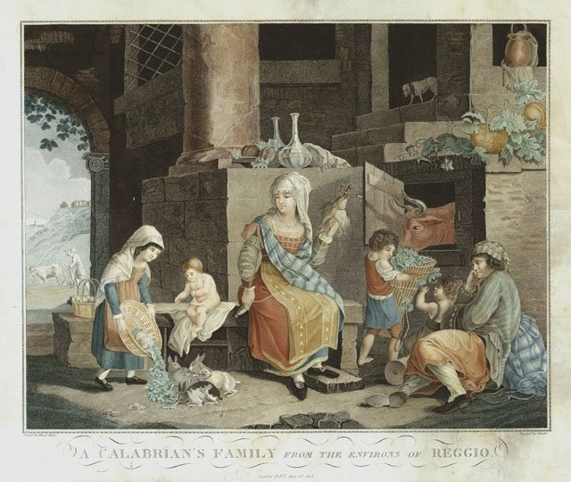 Bucolica raffigurazione di una famiglia calabrese, ritratta in una scena di vita domestica. La stampa trasmette una piacevole sensazione di serenità familiare, in delicata coloritura coeva dovuta direttamente dalla stampa