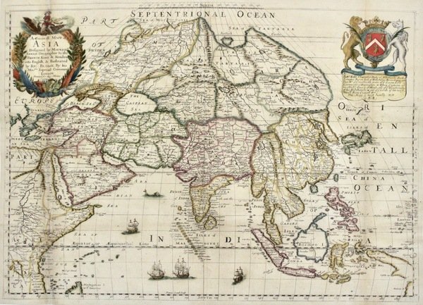 Incisione in rame, mm 395x550, dipinta a mano d'epoca. Blome è autore del primo atlante in foglio stampato in Inghilterra. La carta è caratterizzata dallo stile tipico degli incisori inglesi del Seicento, arricchita da un bel cartiglio e da un importante stemma nobiliare. Le carte di Blome sono piuttosto rare, oltre che importanti per essere le prime carte inglesi di grande formato. Restauri e piccole mancanze e rinforzi.<BR>Copper engraving, mm 395x550, original color. Old color example of Blome's scarce map of Asia, the earliest folio size map of Asia to be engraved and printed in England. Reinforcements and restorations to lacks of paper and tears.