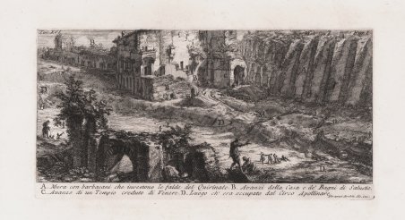 A. Mura con barbacani che investono le falde del Quirinale. B. Avanzi della Casa e de' Bagni di Salustio. C. Avanzo di un Te