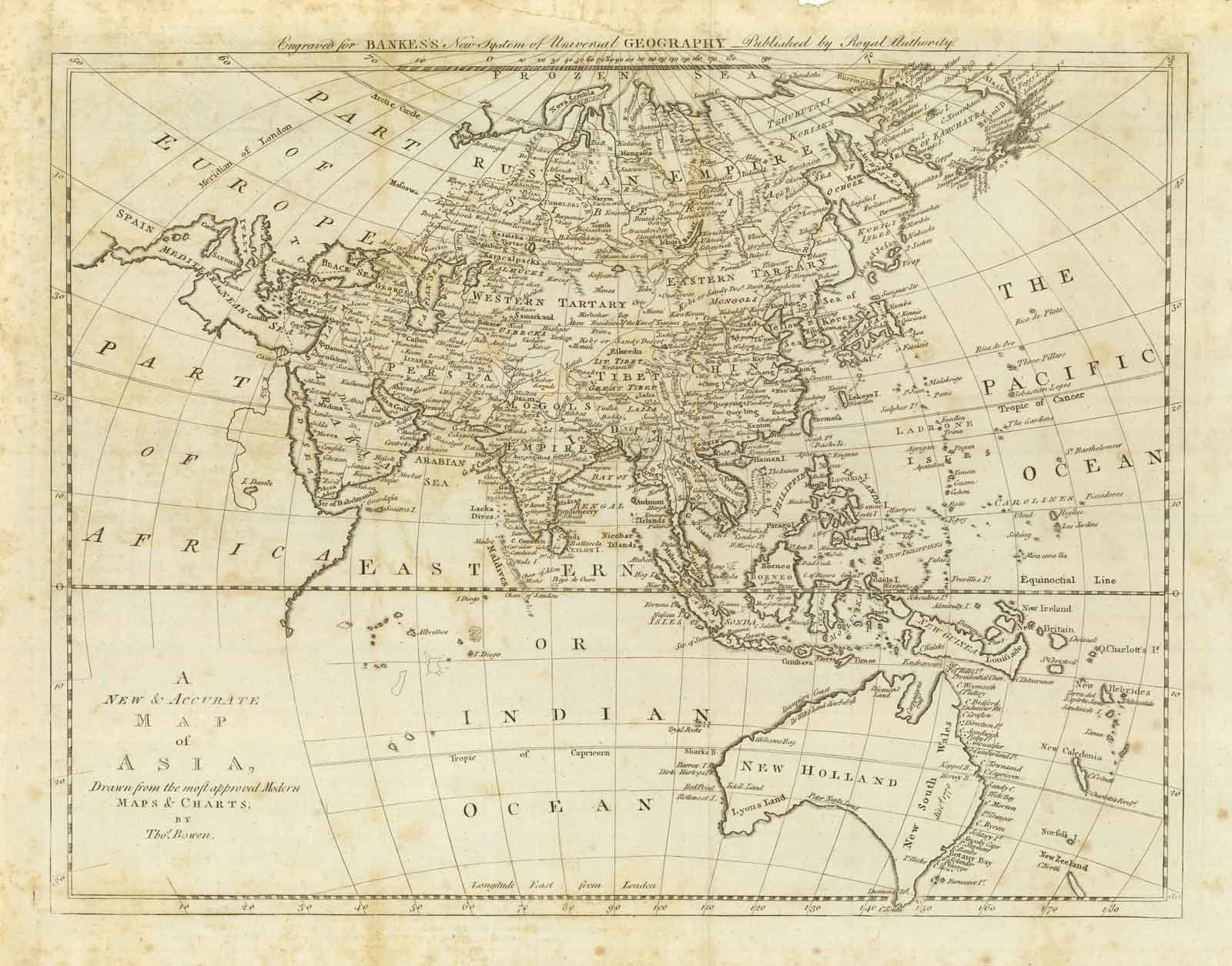 Carta geografica dell' Asia. Incisione inserita nell'opera "A New, Royal, Authentic and Complete System of Universal Geography, Ancient and Modern: Including All the Late Important Discoveries Made by the English, and Other Celebrated Navigators . History and Description of the Whole World. Likewise the Essence of the Voyages of the Most Enterprising Navigators." edita a Londra da J. Cooke nel gennaio del 1787. Pieghe editoriali con restauro al margine superiore