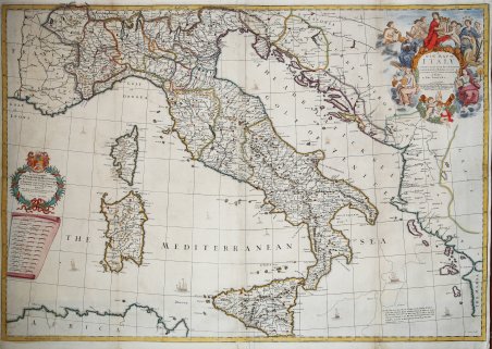 Interessante e rara mappa di grandi dimensioni dell'Italia. In alto a destra, cartiglio decorativo con il titolo. Sul lato sinistro altro cartiglio con le dediche. Secondo stato della mappa, relativa al periodo quando John Senex lavorò con Charles Price (1705 - 10). La carta reca nel cartiglio la firma di Price, Senex e John Maxwell. In basso a destra, accanto alle regioni della Calabria e della Sicilia, è mostrato un semplice schema aggiuntivo specifico sulle due regioni. Viene delieneata la forma della Calabria e della Sicilia nord-orientale secondo come era stata rappresentata nelle carte di Sanson, Visscher, De Wit, Allard, Mortier. ' Accanto, troviamo una dichiarazione degli autori: "We differ from M.Sanson. H.Jaillot. N.Visscher. Allard. P.Mortier. Berry &c. where is evident they have made Italy above 130 miles longer than it really is .", che la differenzia dalle prove di primo stato. John Senex (1678 – 1740) fu uno dei più importanti produttori di mappe ed editori inglesi della prima metà del XVIII secolo. Fu dapprima apprendista dell’importante libraio ed editore Robert Clavell, ma l’associazione con Jeremiah Seller e Charles Price lo portò alla carriera di geometra, cartografo, produttore di globi e di editore e venditore di carte geografiche. Il suo contributo allo sviluppo del commercio di mappe britannico fu tale che fu onorato (1728) dall’elezione a membro della Royal Society, sponsorizzata da alcuni dei più grandi scienziati del periodo. La sua carriera iniziale fu relativamente infelice; la società con Jeremiah Seller e Charles Price durò solamente 3 anni e si concluse con il fallimento, nel 1706. Da allora, fino a circa il 1710, lavorò solamente con Price, dal quale apprese e affinò l’arte incisoria. I due si dedicarono al progetto di un atlante del mondo, in concorrenza a quello del rivale Herman Moll. Quando la partnership terminò, Senex lavorò ad una propria raccolta cartografica, che venne pubblicata con il titolo di The English Atlas (1714); fu uno degli atlanti di maggior successo del secolo, venendo ristampato fino al 1760. Senex lavorò anche come incisore semi-ufficiale per la Royal Society, per il suo stampatore William Taylor, e per figure di spicco al suo interno, tra cui Edmund Halley e William Whiston. Pubblicò, quindi, diverse importanti mappe scientifiche, in particolare le mappe delle eclissi di Halley e Whiston (1715 e 1724). Questi suoi contatti scientifici gli fornirono essenziali ed innovativi elementi tecnici, utile per la sua vasta gamma di globi terrestri e celesti. Con queste solide fondamenta, Senex divenne il più prestigioso editore di mappe del tempo. Alla sua morte (1740) la tipografia venne diretta dalla vedova Mary, che continuò l’attività fino al 1755, quando si ritirò; William Herbert e Robert Sayer acquisirono i diritti per le opere cartografiche, mentre James Ferguson rilevò la parte che riguardava i globi. Charles Price (circa 1679 - 1733) era un incisore, costruttore di strumenti e produttore di mappe; era stato prima apprendista di John Seller poi socio in affari del figlio, Jeremiah. I due si associarono alla corporazione dei mercanti ed editori londinesi lo stesso giorno, 1 settembre 1703. Dopo lo scioglimento della società con Seller, Price lavorò con John Senex (1705 - 10) e George Wildey (1710 - 13). Si sa che era ancora attivo intorno al 1730; nel 1731 fu arrestato per debiti e morì due anni dopo. È noto per aver pubblicato nel 1732 il suo Atlas Maritimus. Questa raccolta nautica contiene mappe datate tra il 1728 e il 1731, ma è chiaro che il lavoro rimase incompiuto, come dimostrano alcune mappe che presentano spazi vuoti nei cartigli, probabilmente riservati alle dediche. Incisione in rame, bella coloritura originale con ritocchi, in ottimo stato di conservazione. Interesting and rare large map of Italy. Top right side decorative cartouche with title. On left side other cartouche with dedications. Second state of the map, relating to the period when John Senex worked with Charles Price (1705 - 10). The map bears the signatures of Price, Senex and John Maxwell in the cartouche. In the lower right, next to the regions of Calabria and Sicily, a simple additional diagram specific to the two regions is shown. The shape of Calabria and northeastern Sicily according to how it had been depicted in the maps of Sanson, Visscher, De Wit, Allard, and Mortier is delineated. ' Next to it, we find a statement by the authors, "We differ from M.Sanson. H.Jaillot. N.Visscher. Allard. P.Mortier. Berry &c. where it is evident they have made Italy above 130 miles longer than it really is .," which differentiates it from first-state ecxample. John Senex (1678 - 1740) was one of the most important English map makers and publishers of the first half of the 18th century. He was first apprenticed to the prominent bookseller and publisher Robert Clavell, but his association with Jeremiah Seller and Charles Price led him to a career as a surveyor, cartographer, globe maker, and map publisher and seller. His contribution to the development of the British map trade was such that he was honored (1728) by election to membership in the Royal Society, sponsored by some of the greatest scientists of the period. His early career was relatively unhappy; the society with Jeremiah Seller and Charles Price lasted only 3 years and ended in bankruptcy, in 1706. From then on, until about 1710, he worked only with Price, from whom he learned and refined the art of engraving. The two devoted themselves to the design of an atlas of the world, competing with that of rival Herman Moll. When the partnership ended, Senex worked on his own cartographic collection, which was published as The English Atlas (1714); it was one of the most successful atlases of the century, being reprinted until 1760. Senex also worked as a semi-official engraver for the Royal Society, for its printer William Taylor, and for prominent figures within it, including