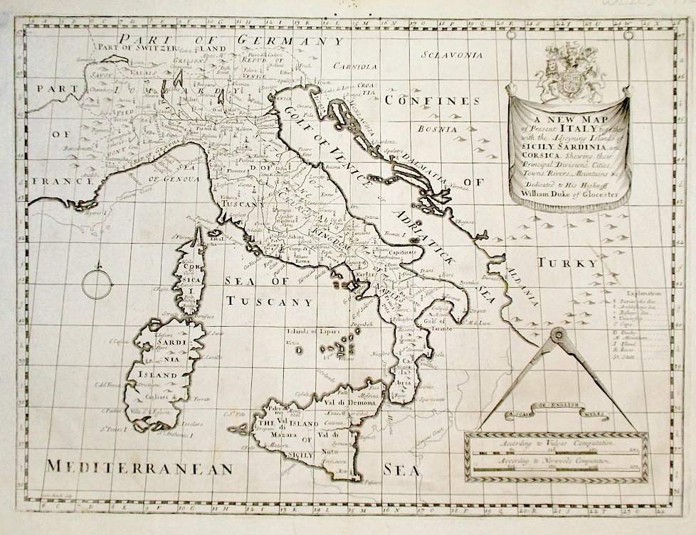 Incisione in rame di Nicholls Sutton. mm 370x490. Titolo in alto, a destra, entro drappo con soprastante stemma reale d'Inghilterra con dedica a William, Duke of Glocester. In basso a destra entro riquadro sormontato da nastro e compasso, due scale grafiche. Carta con margini graduati e reticolato, è tratta da "A New Sett of Maps both of Antient and Present Geography", ristampato più volte dal 1701 al 1738. Edward Wells fu matematico e professore di geografia all'università di Oxford. Questo spiega il chiaro intento divulgativo che diede all'opera, che sebbene non innovativa, conserva intatto il suo fascino originale. Buon esemplare, qualche macchia sporadica, <BR>piega centrale editoriale, in basso restauro marginale, in alto piccoli fori. Borri l'Italia nelle antiche carte dal medioevo all'unità nazionale scheda 277; Borri l'Italia nell' antica cattografia, scheda 151.