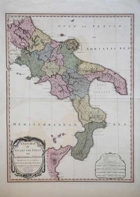 Carta geografica del Regno di Napoli pubblicata a Londra dalla tipografia Laurie & Whittle nel 1794.Questa mappa proviene dal "A General Atlas", una raccolta cartografica iniziata da Thomas Kitchin e concepita da Thomas Jefferys negli anni sessanta del Settecento. Dopo il fallimento di Jefferys nel 1766, l'atlante fu completato per la prima volta da Robert Sayer nel 1773. Dal 1794, l'atlante fu pubblicato dai suoi successori Laurie & Whittle. Le edizioni successive contengono una varietà di autori come d'Anville, Roberts, Dunn, Rocque, Delarochette, Rennell, Zannoni, Dury, Cook, Vancouver, Perouse e altri.L'atlante è stato successivamente ampliato e sostituito dal "A New Universal Atlas" di Laurie & Whittle.Incisione in rame, bella coloritura coeva, in ottimo stato di conservazione. Engraved map of the south of Italy (then the Kingdom of Naples) starting at Abruzzoultra in the north.The map differentiates the political subdivisions of the Kingdom of Naples with fine outline hand-color.The Kingdom of Naples was a major political entity in the southern Italian peninsula from 1282 until 1808. In 1816 it was joined with Sicily to form the Kingdom of the Two Sicilies, and in 1861 it was annexed to form the Kingdom of Italy.This map comes from Thomas Kitchin's A General Atlas. This atlas was conceived of by Thomas Jefferys in the 1760s. Following Jefferys' bankruptcy in 1766, the atlas was first completed by Robert Sayer in 1773. This was Robert Sayer's first terrestrial atlas. From 1794, the atlas was published by his successors Laurie & Whittle. Later editions tend to be more desirable. Thomas Kitchin's name appears on title pages even after his death in 1784. The maps are after a variety of makers such as d'Anville, Roberts, Dunn, Rocque, Delarochette, Rennell, Zannoni, Dury, Cook, Vancouver, Perouse and others.This map is from the 1797 edition of the atlas. This atlas was later expanded and replaced by Laurie & Whittle's A New Universal Atlas. Cfr.