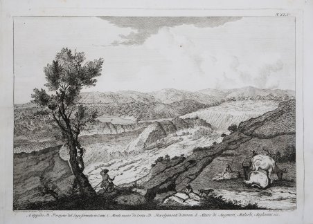 Veduta tratta dal celebre ' Istoria de' fenomeni del tremoto avvenuto nelle Calabrie, e nel Valdemone nell'anno 1783. Posta in luce dalla Reale Accademia delle Scienze, e delle Belle Lettere di Napoli. Napoli, Giuseppe Campo, 1784. Le incisioni dell'Istoria de' fenomeni ' illustrano il rovinoso terremoto calabrese del 1783 e furono commissionate dalla Regia Accademia Napoletana a un gruppo di scienziati, tra cui Michele Sarconi, Angiolo Fasano, Nicolò Pacifico, Padre Eliseo della Concezione e Antonio Minasi, oltre agli architetti e disegnatori Pompeo Schiantarelli, Ignazio Stile e Bernardino Rulli. La spedizione partì da Napoli il 5 aprile 1783 e nel 1784 il resoconto delle sue scoperte fu pubblicato da Campo, rendendola la prima spedizione scientifica sulle conseguenze di un terremoto mai organizzata in Italia. Il terremoto scosse la Calabria e la parte orientale della Sicilia per più di tre anni con diverse scosse, tra cui 5 che registrarono il grado XI della scala Mercalli. Morirono più di 30.000 persone, centinaia di villaggi furono distrutti, le montagne crollarono, i fiumi cambiarono il loro corso creando nuovi laghi e anche le coste furono rimodellate. L'autore dell'Istoria ' è il segretario dell'Accademia, Michele Sarconi. L’Atlante consiste in una raccolta di 68 tavole eseguite dagli architetti Pompeo Schiantarelli ed Ignazio Stile, tutti incisi da Antonio Zaballi, di una grande Carta corografica della Calabria ulteriore, ripiegata più volte, opera di P. Eliseo, e di un disegno raffigurante una «macchina equatoriale». Il progetto di tale opera, unica del suo genere, nasce in seno all’Accademia Napoletana, che istituisce ‘una peregrinazione letteraria nei luoghi della Calabria Ultra e del Valdemone, i quali erano stati i più potentemente della natura ne’ fatal’istanti del suo furore oltraggiati’. La partenza della spedizione degli Accademici Napoletani avviene via mare da Napoli il 5 aprile 1783, un paio di mesi dopo la prima scossa. Il drappello abbastanza nutrito è composto dal segretario dell’Accademia Michele Sarconi, dagli accademici pensionari Angiolo Fasano, Nicolò Pacifico, P. Eliseo della Concezione Teresiano e P. Antonio Minasi Domenicano, dai soci D. Giulio Candida, D. Giuseppe Stefanelli, D. Luigi Sebastiani, dagli architetti addetti ai disegni, Pompeo Schiantarelli con l’incarico di direttore, D. Ignazio Stile e D. Bernardino Rulli. Nella suddivisione dei compiti, il segretario Sarconi prende con sé il disegnatore D. Pompeo Schiantarelli, mentre Pacifico, Fasano e Sebastiani si fanno seguire da D. Ignazio Stile. D. Bernardino Rulli viene aggregato a P. Eliseo e a P. Minasi. Incisione in rame, stampata su carta vergata coeva, minimi aloni di umidità e ossidazioni, per il resto in ' ottimo stato di conservazione. View taken from the ' ' Istoria de' fenomeni del tremoto avvenuto nelle Calabrie, e nel Valdemone nell'anno 1783. Posta in luce dalla Reale Accademia delle Scienze, e delle Belle Lettere di Napoli. Naples: Giuseppe Campo, 1784. The engravings of the ' Istoria de' fenomeni ' illustrate the ruinous Calabrian earthquake of 1783 and were commissioned by the Neapolitan Royal Acadamy to a group of scientists, including Sarconi himself, Angiolo Fasano, Nicolò Pacifico, Padre Eliseo della Concezione and Antonio Minasi, as well as the architects and draughtsmen Pompeo Schiantarelli, Ignazio Stile and Bernardino Rulli. The expedition left Naples on 5th April 1783, and in 1784 the account of their findings was published by Campo, making it the first scientific expedition on the consequences of an earthquake ever to be organised in Italy. The earthquake shook Calabria and the eastern part of Sicily for more than three years with several tremors, including 5 which registered grade XI on Mercalli's scale. More than 30,000 people died, hundreds of villages were destroyed, mountains collapsed, rivers changed their course creating new lakes, and even the coastline was reshaped. Copperplate, printed o contemporary laid paper, ' minimal humidity and oxidation marks, otherwise in excellent condition. Cfr.