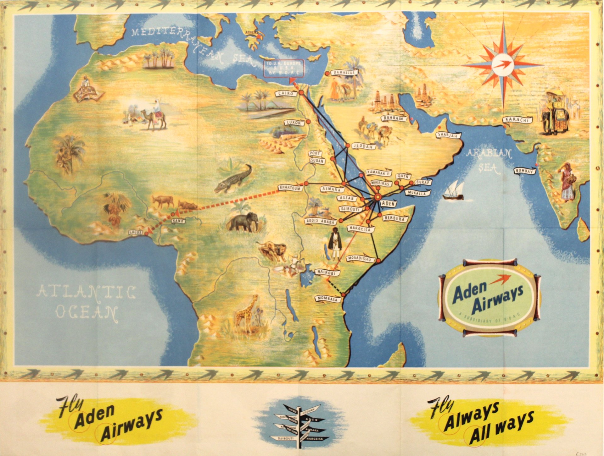 Rare promotional pictorial map for the short-lived Aden Airways, a subsidiary of British Overseas Airways Corporation (BOAC) based in Aden. It was in operation from 1949 to 1967. Mm 445x585, traces of original folds, perfect condition. <BR>