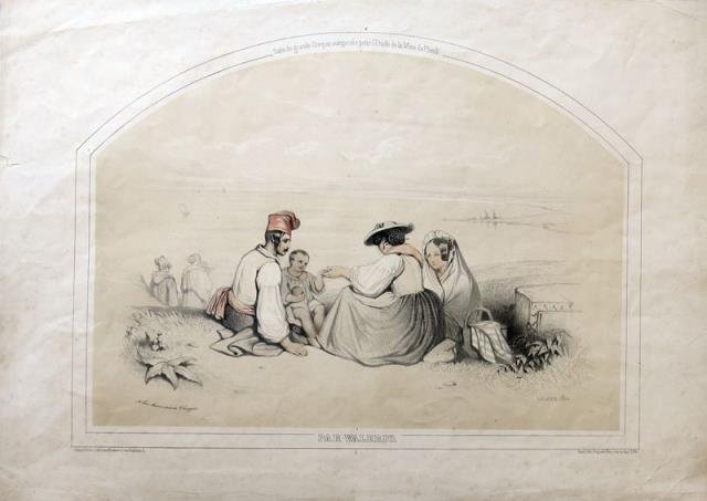 Imp. Lith. Auguste Bry, Gihaut Frères Editeurs, 1842. Litografia (con firma e data stampate “Valerio 1842”, stampata a colori, cm 28 x 38,3 (la parte figurata) più margini. Scena di genere con alcune figure in primo piano e sullo sfondo il mare di Choggia, filetto nero e lunetta. Carta un poco gualcita.