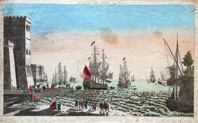 London, 1780 circa. Incisione in rame all’acquaforte, colore d’epoca, cm 23 x 39,3 (la parte figurata). Veduta ottica con navi. Jersey è un'isola posta nel Canale della Manica che assieme alle altre isole del Canale rappresenta gli ultimi resti del ducato di Normandia e fa parte del Baliato di Jersey. Macchie e difetti del foglio, margini stretti e rifilati su tutti i lati.