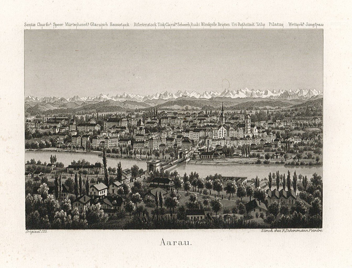 Stampa, antica ed originale, raffigurante il panorama della cittadina in raffinata acquatinta. Inserita nell'opera "Souvenir de la Suisse" edita a Zurigo. Autore: Dikenmann Rudolf dis. (1793 Zürich 1883). Luogo: Aarau. Anno: 1860 ca. Tecnica: acquatinta. Dimensioni: 74x112 mm