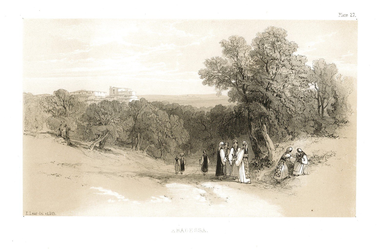Veduta panoramica della cittadina, stampata su fondino seppia