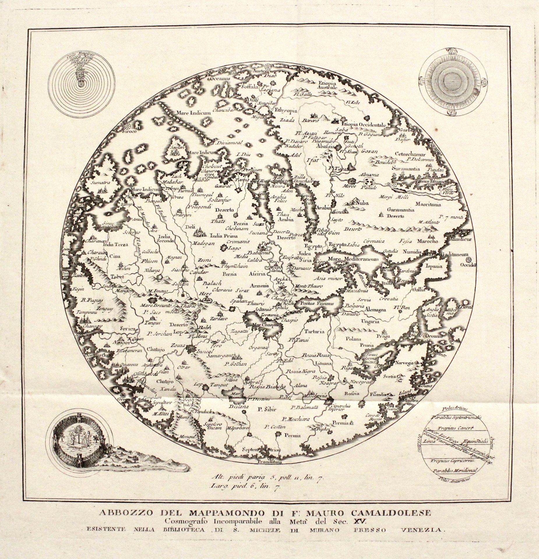 Incisione in rame, mm 340x350, tratto da Placido Zurla "Il mappamondo di Fra Mauro camaldolese”, antico saggio che descrive e riproduce in misura ridotta la famosa carta realizzata originariamente nel 1450 : il mappamondo precolombiano di Fra Mauro è considerato il più grande monumento della cartografia medievale. Si tratta di un planisfero circolare disegnato su pergamena e inserito in una cornice di legno, del diametro di circa due metri. Una copia del mappamondo fu realizzata da Fra Mauro e dal suo assistente Andrea Bianco, un marinaio-cartografo, su commissione del re Alfonso V del Portogallo. Questa copia fu completata il 24 aprile 1459 e inviata in Portogallo, ma non è sopravvissuta fino ai giorni nostri. La mappa originale di Mauro è stata scoperta nel monastero di San Michele a Murano, dove il cartografo camaldolese aveva il suo studio. La mappa è ora appesa in una scala della Biblioteca Nazionale Marciana di Venezia, ma è visibile entrando nel Museo Correr, dove è accessibile dalla sala più orientale su richiesta degli addetti al museo. Questa edizione italiana del XIX secolo della mappa è uno dei pochi facsimili dei primi mappamondi in circolazione ed è piuttosto rara sul mercato. La stampa è in perfetto stato di conservazione, con le tracce di pieghe editoriali.