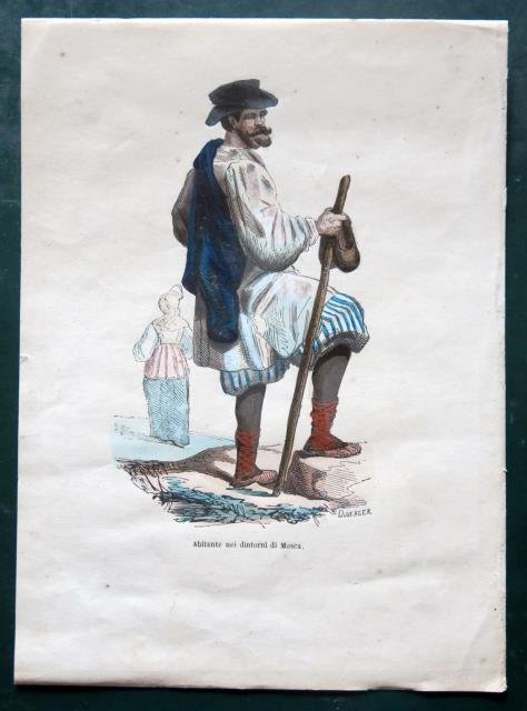Tratta da "Usi e costumi di tutti i popoli dell'universo", 1860 circa. Litografia in coeva coloritura d'epoca, cm 16 x 25 circa (il foglio). Una piega al margine bianco superiore sufficientemente distante dall'immagine, bella la coloritura, buono lo stato di conservazione.