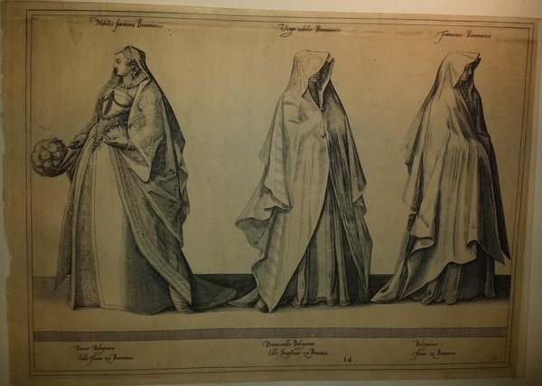 Abiti femminili Bolognesi: Nobilis foemina Bononiensis.Virgo nobilis Bononiensis. Foemina Bononiensis. Dame Bolognese; Edle Fraw zu Bononien. Damoiselle Bolognese; Edle Jongfraw zu Bononia. Bolognese. Fraw zu Bononien