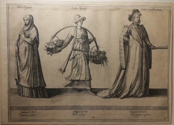 Incisione su rame di mm 235 x 302. Vergatina leggera. Filigrana fiore. Foglio di ottima qualità. In alto sopra la rispettiva immagine: "Hortulana Papiensis. Rustica Papiensis. Nobilis Virgo Ferrarensis". In basso sotto la rispettiva immagine "Jardiniere de Pavie; Gartherin zu Pasey. Villageoise de Pavie; Bawrin zu Pasey. Damoiselle Ferrarese; Edele Jongfraw zu Ferrar". Quindi indicazione della tavola n "15". Proviene da "Habitus variarum orbis. Habitz de nations estrages. Trachten mancherley volcker des erdskreys." Caspar Rutz, Mecheln 1581. Jean-Jacques Boissard (1528 - October 30, 1602) fu un antiquario francese e un poeta. Nacque a Besançon e fu educato a Leuven, ma disgustato dal suo istruttore, lasciò segretamente il seminario e viaggiò attraverso la Germania per arrivare in Italia, dove rimase numerosi anni, spesso ridotto in povertà. Il tempo rascorso in Italia lo educò al gusto per l'antiquariato. Visitò quindi le isole greche finchè una grave malattia non l'obbligò a tornare a Roma. Completata la sua collezione di artefatti antichi romani, tornò in Francia, ma non potendo praticare la religione Protestante, si trasferì a Metz, dove rimase fino alla sua morte. Julius Goltzius era il figlio di Hubrecht Goltzius, e divenne egli stesso pittore. Non si sa molto di lui tranne che si sposò ad Anversa il 27 settembre 1581 e morì circa nel 1595. Le sue maggiori opere furono le incisioni dei quattro Evangelisti sono conservati al "Dutch Renaissance History Painting". Jean-Jacques Boissard (1528 - October 30, 1602) was a French antiquary and Latin poet. He was born at Besançon and educated at Leuven; but disgusted by the severity of his master, he secretly left the seminary there, and travelled through Germany to Italy, where he remained several years and was often reduced to poverty. His time in Italy gave him a taste for antiquities, and he soon formed a collection of curious artefacts from Rome and its vicinity. He then visited the islands of Greece, but a severe illness obliged him to return to Rome. Here he resumed his favourite pastimes, and having completed his collection, returned to France; but not being permitted to profess publicly the Protestant religion, which he had embraced some time before, he withdrew to Metz, where he remained till his death. Julius Goltzius was the son of Hubrecht Goltzius, himself a painter of "History Paintings" and followed in his father's and his teachers' footsteps. We know little about him save that he was married in Anvers / Antwerp on 27 September 1581 and died about 1595. His engravings of the four Evangelists are in the mainstream of Dutch Renaissance History Painting and the needs of the print market in the late 16th century in a country in revolt from King Philip II of Spain, their hereditary ruler but a Catholic, and riven by civil war between Catholics and Protestants. The choice of subject matter is appropriate for Catholics but would also especially appeal to Protestants seeking a biblically-based religion. Although Goltzius has been identified as the son of Hendrick Goltzius, Benezit rejects that assertion. According to the St. Matthew and St Mark engravings, the works are based upon drawings by Anthonie Blocklandt, a pupil of Frans Floris and an artist influenced by Parmigianino during a 7-month trip to Italy; in 1577, he entered into the Painter's Guild in Utrecht in 1577. The works were published by Hans II Liefrinck, a painter, engraver, and print publisher active in Anvers from 1581 on. Graesse p. 454