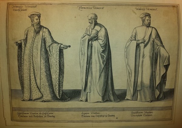 Abiti maschili di Venezia: Nobilis Venetus consilij privati. Patritius Venetis. Nobilis Venetus. Gentilhomme Venetian du Conseil privè; Edelman und Rathsherr zu Venedig. Seigneur Venetian; Edelman von Deschlecht zu Venedig. Gentilhomme Venetian; Venedischer Edelman
